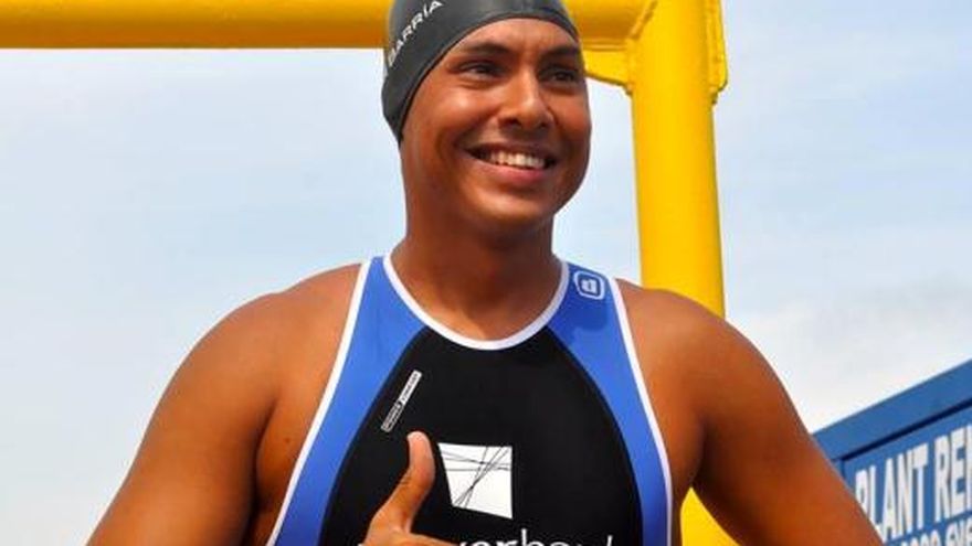 La travesía del nadador panameño César Barría, desde la Calzada de Amador hacia la Isla Taboga, acaba de comenzar. Luego de un acto protocolar, donde la artista Ingrid De Icaza cantó el Himno Nacional de Panamá y el sacerdote irlandés Juan Rooney le dio la bendición; Barría subió a una grúa que lo introdujo al agua en la Calzada de Amador. FOTO: Francisco Franco