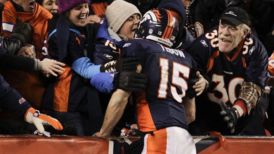 Uno de los equipos con más historia en los playoffs de la NFL se chocó el domingo con un renovado Tim Tebow y sus Broncos de Denver. Lástima, Steelers de Pittsburgh: la magia ha vuelto. Tebow encontró a Demaryius Thomas con un emocionante pase para touchdown de 80 yardas en la primera jugada del tiempo extra y los Broncos vencieron a los atónitos Steelers 29-23 en la ronda de comodines de la Conferencia Americana. La jugada duró 11 segundos y fue el final más rápido de una prórroga en la historia de la NFL. Thomas capturó el balón en la yarda 38 de Denver, frenó con un brazo a Ike Taylor y luego superó a Ryan Mundy en la carrera hasta la zona de anotación. Tebow se arrodilló en la otra punta del campo y sacudió un puño en señal de triunfo antes de dar una vuelta de celebración ante un estadio eufórico. "Cuando lo vi anotar, en primer lugar, sólo pensé, "gracias, Señor""", comentó Tebow. "Entonces, yo estaba corriendo bastante rápido, persiguiéndolo; ¡como si pudiera alcanzar a D.T.! Luego simplemente salté a las tribunas; primera vez que lo hago. Fue divertido. Entonces, puse una rodilla en el suelo y agradecí al Señor nuevamente y traté de celebrar con mis compañeros de equipo y aficionados", agregó. Gracias a 316 yardas en pases de su quarterback, los Broncos (9-8) se preparan para visitar en la segunda ronda a los primeros preclasificados, los Patriots de Nueva Inglaterra, la noche del sábado. "Sencillamente somos un equipo combatiente. Con mucha resistencia", dijo el cornerback de los Broncos Champ Bailey. "En cualquier situación adversa, encontraremos una manera de salir de ella. Todos dicen que apostamos por la postemporada, estamos dentro. Hicimos algo correcto a lo largo del camino. Estamos dentro. Ganamos un juego. Ahora, tenemos que tratar de ganar otro". Los Steelers (12-5) perdieron pese a que Ben Roethlisberger los rescató de una desventaja de dos touchdowns en el entretiempo con diez puntos en los últimos 10 minutos. Pittsburgh perdió el lanzamiento de una moneda para determinar la posesión inicial del tiempo extra. Tebow, quien condujo cinco remontadas en el cuarto período y tres victorias en tiempo adicional durante la temporada regular, no perdió tiempo para completar su pase con Thomas y terminar el enfrentamiento. Mundy jugaba en lugar de Ryan Clark, el tacleador líder de los Steelers, quien no participó debido a un problema de hipertensión agravado por la altitud de Denver. Clark fue uno de varios Steelers que quedaron fuera de la alineación o estaban lesionados. Tampoco jugó Maurkice Pouncey, center participante en el Pro Bowl, que fue reemplazado por Doug Legursky, quien cometió un error justo antes del descanso que alejó a Pittsburgh del rango de gol de campo. Luego que Thomas corrió a la largo de la banda de los Broncos, la multitud festejó con frenesí, incluido el vicepresidente ejecutivo del equipo John Elway, y el estadio Sports Authority Field se sacudió como ocurría con el viejo Mile High Stadium en la década de los 90. Elway, arquitecto de muchos de esos momentos mágicos en el antiguo estadio, saltó de gozo en su palco. Los Patriots golpearon fuertemente a los Broncos el mes pasado, cuando los superaron por 41-23.