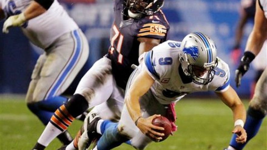 Un gran sobresalto invadió el estadio cuando Jay Cutler se retorcía de dolor en el campo. El quarterback se repuso y la defensiva hizo el resto para la victoria. Cutler regresó con una magulladura en las costillas y Brian Urlacher recuperó un crucial balón perdido para que los Bears de Chicago derrotaran el lunes en la noche 13-7 a los Lions de Detroit y lograran su cuarto triunfo consecutivo. En verdad fue una noche nada fácil para los líderes de la División Norte de la Conferencia Nacional, en particular para su quarterback, pero lograron la victoria tras una semana de receso y posiblemente sepultaron todas las posibilidades de Detroit (2-4) aunque se llevaron un gran susto. En el segundo cuarto, Cutler fue atrapado por Ndamukong Suh y terminó yendo al vestuario para que lo examinaran de las costillas. "(Cutler) es un jugador resistente", dijo el entrenador de los Bears, Lovie Smith. "La mayoría de la gente pensó que Jay se levantaría. A menos que se trate de una pierna rota o algo así, pero se pone de pie. Es un jugador resistente. Mostró agallas con ese esfuerzo. Tenía algo de dolor, pero se aguantó (en el partido)", agregó. Cutler regresó al terreno de juego en la segunda mitad y completó 16 de 31 pases para 150 yardas y un touchdown en el encuentro y los Bears (5-1) se impusieron gracias a la defensiva que contuvo a los Lions. La derrota fue un gran revés para Detroit, que está en último lugar, y que era el equipo que muchos esperaban sería aspirante al campeonato de división después de que alcanzara en 2011 la postemporada por primera vez en más de una década. Los Lions simplemente nunca pudieron entrar en ritmo al tiempo que desperdiciaron las oportunidades que tuvieron. Su mayor traspié ocurrió a principios del tercer cuarto, cuando Joique Bell perdió un balón en la línea de gol con marcador de 13-0 a favor de los Bears. Urlacher recuperó la pelota y Chicago defendió la ventaja a partir de ese momento. Los Bears propinaron a Detroit su cuarto descalabro en cinco encuentros. Brandon Marshall atrapó seis pases para 81 yardas y consiguió un touchdown en la primera posesión del balón de Chicago. Matt Forte corrió para 96 yardas y los Bears no afrontaron peligro alguno con su defensiva bien concentrada de nuevo. Para los Lions la noche fue difícil. Matthew Stafford completó 28 de 46 pases para 261 yardas tras encabezar la ofensiva final que dio el triunfo a los Lions la semana pasada sobre Filadelfia. Calvin Johnson tuvo problemas para sacudirse el marcaje de Charles Tillman, de los Bears, y terminó con tres atrapadas para 34 yardas. Johnson soltó un pase profundo aun cuando estaba desmarcado en la mitad del partido. "Es difícil completar jugada frente a Charles Tillman, uno de los mejores jugadores de la liga, y enfrentarlo toda la noche", señaló Smith. Los Lions perdieron a su receptor Nate Burleson por una lesión en la rodilla en el tercer período debido al golpe que recibió de Tim Jennings después de capturar el balón.