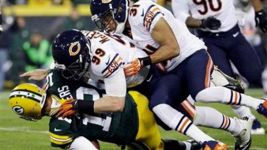 Josh McCown ganó la batalla de los quarterbacks suplentes, luego que los Packers perdieron a Aaron Rodgers, y los Bears de Chicago se impusieron 27-20 a Green Bay, el lunes por la noche. Brandon Marshall y Matt Forte dieron ayuda suficiente a McCown, para que los Bears cortaran una racha de seis derrotas consecutivas en los duelos contra los Packers, sus rivales acérrimos de la División Norte de la Conferencia Nacional. Green Bay vio cortada además una racha de cuatro victorias en fila, pero la preocupación principal de los Packers es la salud de Rodgers, diestro, que se lastimó el hombro izquierdo al ser capturado por Shea McClellin en la primera serie ofensiva del encuentro. Rodgers hizo algunos pases de calentamiento, pero después de que lo examinó el personal médico, se marchó a los vestuarios. No se le volvió a ver sino a la mitad del tercer cuarto, cuando volvió al campo, ya sin uniforme. Aunque saludó a los espectadores con la mano derecha y no pareció llevar cabestrillo, conservó la mano izquierda dentro del bolsillo. "Tiene una lesión de hombro", se limitó a decir el entrenador de los Packers, Mike McCarthy. "Los médicos quieren realizar más análisis. No tienen un diagnóstico exacto. Tendremos más información, probablemente mañana". Cuando se le presionó para que diera más información, McCarthy insistió en que no la había. "No hay un cronograma ni un diagnóstico", dijo. "En eso estamos". Los Bears (5-3) se aprovecharon de la ausencia de Rodgers para derrotar a los Packers (5-3). Marshall realizó siete atrapadas para 107 yardas y un touchdown, mientras que Forte aportó 125 yardas y otra anotación con sus acarreos.