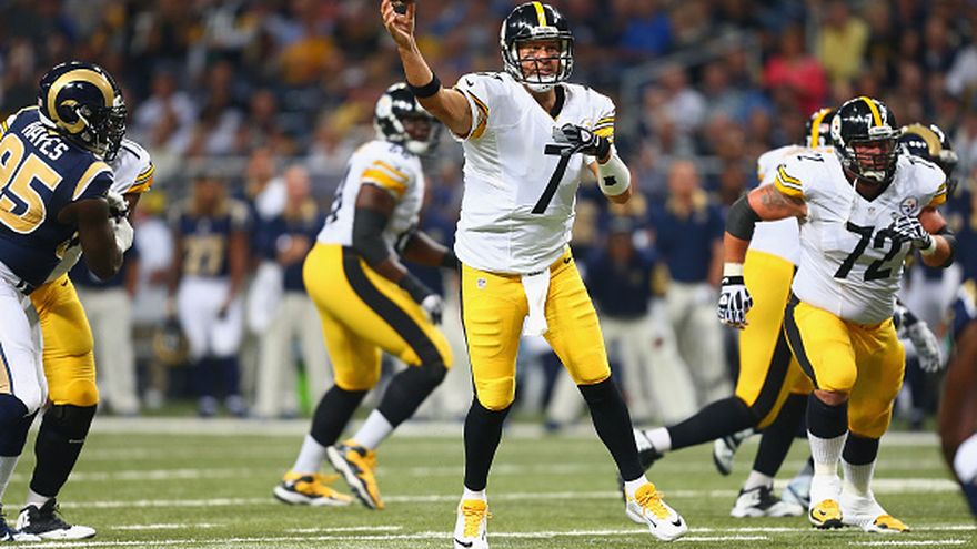 El quarterback Ben Roethlisberger, de los Steelers de Pittsburgh, fue sacado del partido después de sufrir una lesión de rodilla izquierda en una captura de los Rams en el tercer cuarto del partido en San Luis.