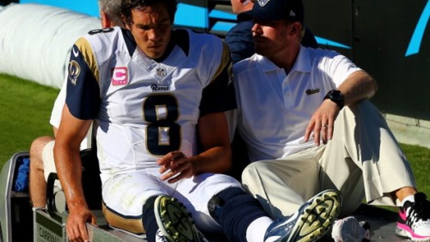 El quarterback de los Rams de San Luis Sam Bradford se rompió los ligamentos de la rodilla izquierda y no volverá a jugar esta temporada. La lesión fue confirmada el lunes, luego de que se le hiciesen al jugador exámenes de resonancia magnética el domingo, tras la derrota 30-15 ante Carolina. Bradford se rompió el ligamento anterior cruzado en el cuarto período, al caer pesadamente sobre su rodilla luego de ser empujado fuera de la cancha por el safety Mike Mitchell. El mariscal fue sacado en un carrito. Lo reemplazó Kellen Clemens, el único otro mariscal de campo que tienen los Rams (3-4) en su nómina. Bradford, primera selección del draft del 2010, generó 1.687 yardas y 14 touchdowns con sus pases esta temporada. Sufrió cuatro intercepciones. El equipo había ganado sus dos partidos previos y Bradford había hecho tres pases de touchdown en cada uno de ellos. Bradford tiene un historial de lesiones. Se perdió seis partidos en el 2001 tras torcerse un tobillo y se tuvo que operar un hombro en el 2009, cuando jugaba con Oklahoma a nivel universitario.