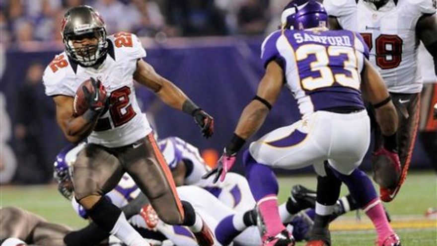 El novato Doug Martin sumó 214 yardas totales y dos touchdowns para que los Buccaneers de Tampa Bay vencieran el jueves por 36-17 a los Vikings de Minnesota, para propinarles su primera derrota en casa de la temporada. Martin recibió un pase pantalla para correr 64 yardas y anotar, uno de los tres touchdowns lanzados por Josh Freeman, lo que le dio a Tampa Bay una ventaja de 27-10 luego 1:21 de haber empezado el segundo tiempo. Luego Martin, la primera selección colegial de la estatal de Boise, coronó una ofensiva de más de 9 minutos con una anotación de 1 yarda en el cuarto período para frustrar la oportunidad de un regreso para Minnesota (5-3). Adrian Peterson consiguió una carrera de 64 yardas, la más larga de la temporada para él, para anotar que puso a los Vikings 30-17, pero su balón perdido en territorio de Minnesota en el segundo cuarto provocó un touchdown directo de los Buccaneers (3-4).