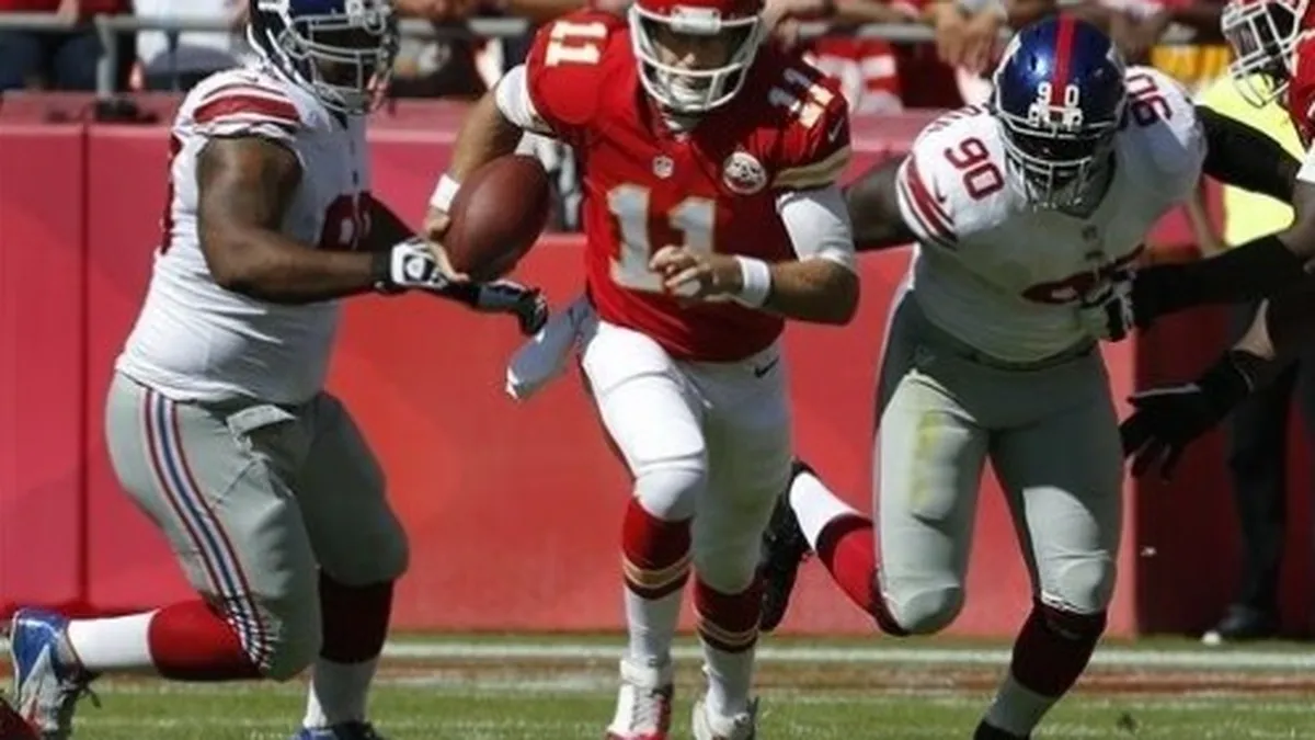 Alex Smith lanzó tres pases de touchdown, Dexter McCluster devolvió un despeje 89 yardas para otra anotación y los invictos Kansas City Chiefs hundieron a los New York Giants a una marca 0-4, con su victoria 24-7 este domingo. Smith completó pases de touchdown de cuatro, dos y 35 yardas para los Chiefs (4-0), quienes bajo la dirección de Andy Reid ya han duplicado su total de victorias del 2012. Son el segundo equipo que pasa de una temporada de dos triunfos a un inicio 4-0 al año siguiente. Los Giants, que caían 17-7 después de tres cuartos, están 0-4 por primera vez desde 1987. Eli Manning se conectó con Victor Cruz en una jugada de 69 yardas para la única anotación de New York. La defensiva de Kansas City capturó a Manning en tres ocasiones. Smith fue interceptado dos veces, en las primeras entregas de balón de los Chiefs este año, también perdieron un balón suelto.