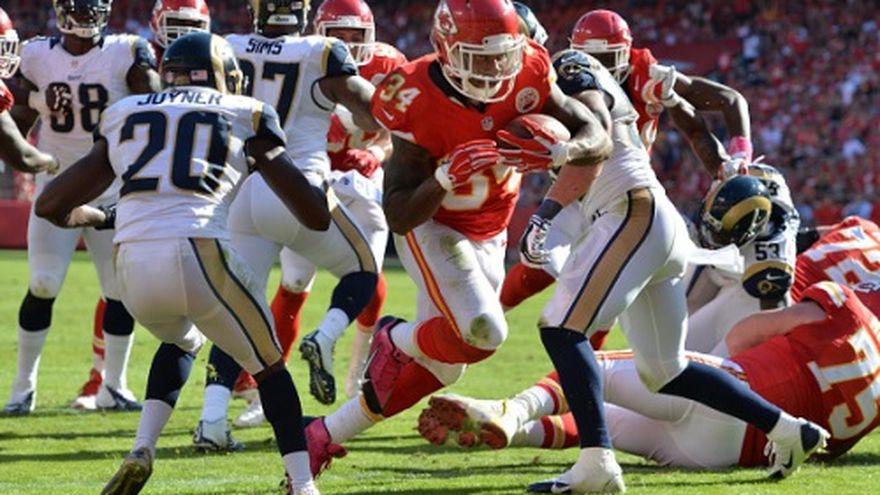 KANSAS CITY, Missouri, EE.UU. (AP) -- Jamaal Charles corrió para dos touchdowns, Knile Davis devolvió una patada 99 yardas para otra anotación y los Chiefs de Kansas City aplastaron el domingo 34-7 a los Rams de San Luis. El brasileño Cairo Santos agregó un par de goles de campo por Kansas City (4-3), incluyendo una marca personal de 53 yardas. Alex Smith completó 24 de 28 envíos para 226 yardas, mientras que Davis coronó un ataque de 34 puntos sin respuesta con una corta carrera de anotación hacia el final del encuentro. Justin Houston tuvo tres de las siete capturas de los Chiefs. Los mermados Rams (2-5) perdieron por sexta ocasión en fila ante Kansas City desde el 25 de septiembre de 1994, cuando aún estaban en Los Ángeles. Austin Davis pasó para 160 yardas con un touchdown y una intercepción.