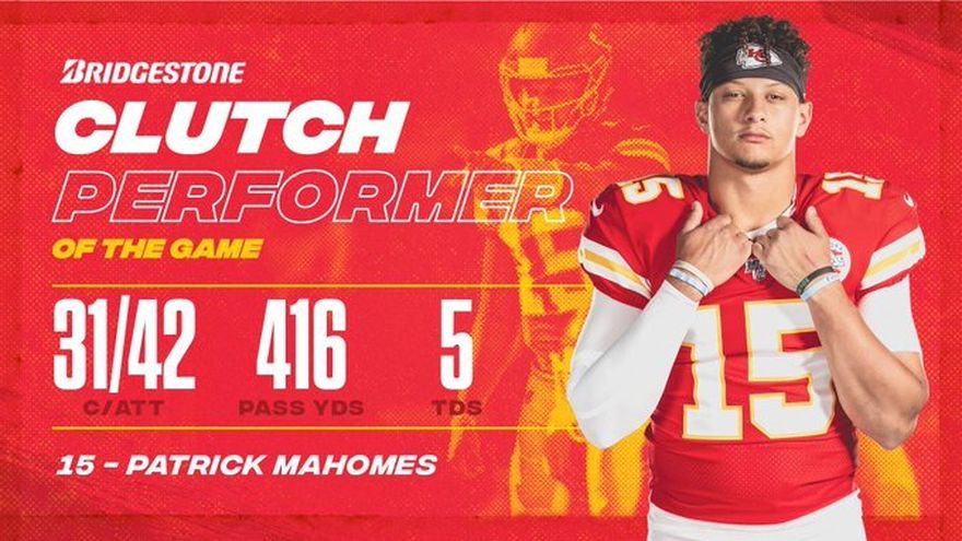 Mahomes completó 31 de 42 pases para 416 yardas con 5 pases de anotación.