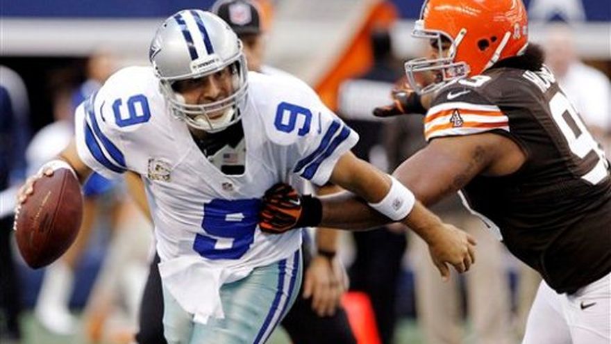 Tony Romo perseveró a pesar de haber sido capturado siete veces y evitó los costosos errores que han aquejado su carrera mientras se escabullía de la constante presión. Justo cuando tenía a Dallas en posición de terminar una ofensiva y vencer a Cleveland, el quarterback perdió un balón que dejó a los Cowboys luchando por sobrevivir un final alocado el domingo en el primer partido que se va a tiempo extra en su estadio. Finalmente, Dallas encontró una forma de extender a 12 la racha de derrotas de los Browns como visitantes cuando Dan Bailey pateó un gol de campo de 38 yardas con 6:07 restantes en el periodo adicional, dándole a los Cowboys una victoria de 23-20. Bailey también hizo una patada que empató el encuentro cuando quedaban dos segundos en el tiempo regular. "Lo tuvimos (el partido) en la bolsa todo el tiempo", dijo un sonriente Jerry Jones, el dueño de los Cowboys, al ingresar a los vestidores después del juego. No tanto, pero sí se veía ganado en las postrimerías del último período cuando Romo acababa de poner a Dallas adelante 17-13 con un pase de anotación de 28 yardas a Dez Bryant, que sumó 145 yardas por aire, una marca personal en su carrera. En la siguiente jugada Anthony Spencer capturó al novato Brandon Weeden de los Browns, obligó a un balón suelto y lo recuperó en la yarda 18 de Cleveland con 5:45 por jugarse. Pero Romo lo devolvió casi de inmediato, al cometer un fumble dos jugadas más tarde —su primer balón perdido en tres encuentros— tras ser golpeado por Frostee Rucker cuando intentaba evitar la sexta captura de quarterback por parte de Cleveland. La línea ofensiva de Dallas no contó con el tackle izquierdo Tyron Smith durante la mayor parte del partido debido a una lesión en un tobillo. "Obviamente que necesito detener la pelota y no dejar que el señor llegue por detrás y permitir que el balón se me escape", dijo Romo. Los Browns (2-8) obtuvieron otra oportunidad y se pusieron arriba 20-17 gracias a un pase de 17 yardas de Weeden a Benjamin Watson con 1:07 en el reloj. Dallas llegó hasta la yarda nueve de Cleveland en los últimos segundos, favorecido por una penalización a Sheldon Brown tras una interferencia a un pase de 35 yardas. Los Cowboys intentaron lanzar pases a la zona de anotación en dos ocasiones, y al no lograrlo se tuvieron que conformar con la patada de Bailey que empató el marcador. A pesar de la constante presión, de todas formas Romo completó 35 pases en 50 intentos para 313 yardas con el touchdown a Bryant, que atrapó 12 balones para 145 yardas, una marca personal en su carrera. "Tony hizo un trabajo realmente bueno al jugar con aplomo", dijo Jason Garrett, entrenador de los Cowboys. "Cuando te desempeñas como quarterback y tienes muchas jugadas negativas... es fácil desesperarse y hacer algunas cosas que no deberías hacer". En otro encuentro, Alfonzo Dennard se vio a sí mismo en la pantalla de video mientras acarreaba una intercepción a lo largo de 87 yardas para touchdown. Quería ver si el estelar quarterback novato que lanzó el pase podría alcanzarlo. Por la forma en que estaban jugando los Patriots de Nueva Inglaterra —con su poderosa ofensiva usual, grandes jugadas defensivas y un touchdown en una devolución de patada— no había manera de que Andrew Luck y los Colts de Indianápolis pudieran superarlos. Los Patriots, el equipo con más anotaciones en la NFL, igualaron el domingo su récord de puntos anotados en un solo partido con una aplastante victoria de 59-24. "Los entrenadores quieren que juguemos con agresividad", dijo Dennard, cuyo touchdown puso el marcador 45-17. "Eso es lo que estaba haciendo allá afuera". El primer duelo entre Tom Brady, tres veces campeón del Super Bowl, y el astro novato Luck estuvo de lo más desequilibrado. Brady lanzó tres pases de touchdown. Luck sufrió tres intercepciones. "Son lo suficientemente buenos", dijo éste. "No necesitan esos regalos, pero para crédito de ellos, los generaron y nosotros no". Sin embargo, podrían necesitarlos más después de que el tight end Rob Gronkowski salió de la cancha con una lesión en un brazo cuando quedaban unos cuatro minutos en el partido. Comcast SportsNet de Nueva Inglaterra reportó que las radiografías mostraron que Gronkowski tenía un brazo roto, pero ni el equipo ni la cadena especificaron cuál. Gronkowski atrapó dos pases de anotación el domingo, con lo que ya suma siete recepciones de touchdown en sus últimos cuatro partidos y 10 en la temporada. En otros juegos de la jornada, los Jets de Nueva York vencieron 27-13 a los Rams de San Luis; los Bengals de Cincinnati 28-6 a los Chiefs de Kansas City; los Packers de Green Bay 24-20 a los Lions de Detroit; los Redskins de Washington 31-6 a los Eagles de Filadelfia; los Falcons de Atlanta 23-19 a los Cardinals de Arizona y los Texans de Houston 43-37 a los Jaguars de Jacksonville. Además, los Buccaneers de Tampa Bay derrotaron 27-21 a los Panthers de Carolina; los Saints de Nueva Orleáns 38-17 a los Raiders de Oakland; los Broncos de Denver 30-23 a los Chargers de San Diego y los Ravens de Baltimore 13-10 a los Steelers de Pittsburgh.