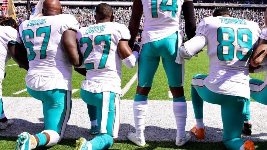 Decenas de jugadores de la liga se arrodillaron durante los partidos del domingo mientras se escuchaba el himno de Estados Unidos en el estadio, en la manifestación más grande desde que el ex mariscal de campo de los San Francisco 49ers Colin Kaepernick iniciara esta forma de protesta en 2016.