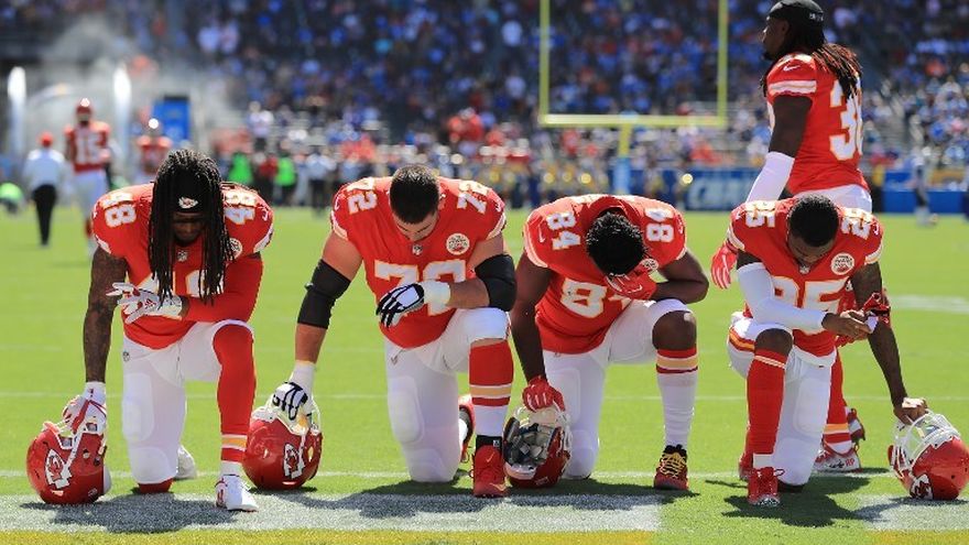 Kaepernick, entonces con los 49ers, comenzó la ola de protestas en la NFL cuando se sentó durante el himno nacional antes de un partido de pretemporada en agosto del 2016. Durante la temporada regular, modificó su protesta sobre la injusticia social y se arrodillaba durante el himno.