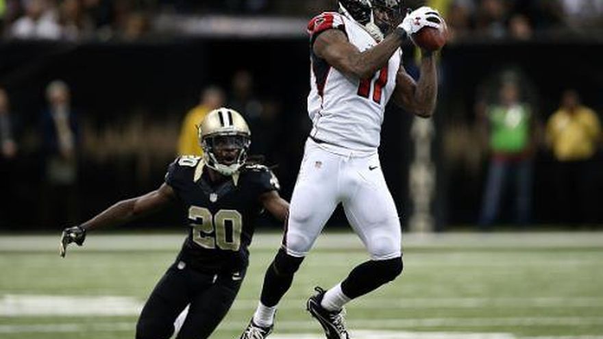 NUEVA ORLEÁNS (AP) -- Julio Jones regresó tras recuperarse de una lesión de cadera y atrapó siete pases para 107 yardas, con lo que los Falcons de Atlanta siguieron en la puja por un boleto de playoffs al derrotar el domingo 30-14 a los Saints de Nueva Orleáns. Matt Ryan completó 30 de 40 pases para 322 yardas y una anotación, mientras que Devonta Freeman corrió para anotar en un acarreo de 31 yardas por Atlanta (6-9), que puede ganar el título en la División Sur de la Conferencia Nacional si vence a Carolina la semana próxima. Los Saints (6-9), que perdieron tres balones en el cuarto periodo, sufrieron su quinta derrota consecutiva como locales y quedaron eliminados. Jimmy Graham soltó un ovoide dentro de la yarda uno de Atlanta en los albores del último cuarto. Los Saints tuvieron la oportunidad de buscar la anotación que les diera el triunfo en los últimos tres minutos, pero Robert McClain interceptó un pase de Drew Brees en el territorio de Nueva Orleáns. Ello preparó la escena para un gol de campo, y Osi Umenyiora devolvió 86 yardas un balón soltado por Brees para un touchdown cuando el tiempo expiraba.
