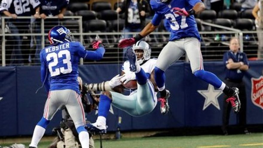 Osi Umenyiora y los Giants de Nueva York se sentían muy mal por creer que acababan de sufrir un derrumbe monumental. Pero no todo estaba perdido: un análisis de la repetición de la jugada revocó un touchdown de los Cowboys de Dallas con 10 segundos por jugarse y los Giants resistieron el domingo para vencer 29-24 tras haber dejado escapar una ventaja de 23 puntos, consolidándose en el liderato de la División Este de la Conferencia Nacional. "Después de haber ido ganando 23-0 y verlos remontar así y ganar, era una sensación muy desagradable. Pero afortunadamente (el rival Dez Bryant) no estaba en el terreno de juego", dijo Umenyiora. "No creo que sea suerte. Simplemente él no logró la jugada". Bryant saltó e hizo una atrapada impresionante entre dos defensores de los Giants en la parte trasera de la zona de anotación. Tras declararlo un touchdown de 37 yardas, los árbitros observaron una repetición de la jugada que mostró que los dedos de Bryant cayeron primero fuera del terreno cuando extendió su mano derecha hacia el piso para preparar su caída. "Todo el mundo pensó que (el partido) había terminado", dijo Jason Pierre-Paul, que tuvo su primera intercepción y touchdown para los Giants. Después del touchdown revocado, los Cowboys (3-4) no pudieron ingresar a la zona de anotación a pesar de que tuvieron otras tres jugadas. Nueva York (6-2) ha ganado seis partidos de siete desde que arrancó la temporada con una derrota frente a los Cowboys el 5 de septiembre, cuando los Giants se convirtieron en el primer campeón defensor del Super Bowl en perder el partido inaugural de la NFL disputado a media semana, el cual se ha convertido en una tradición en la última década. Pero ahora, a la mitad de su calendario, los Giants son el único equipo del Este de la Conferencia Nacional que lleva foja ganadora. Filadelfia (3-4) y Washington (3-5), los otros clubes de la división, perdieron el domingo. Los Giants mejoraron a 4-0 en el estadio de los Cowboys desde que el palacio de Jerry Jones para el fútbol americano abrió sus puertas en 2009 con una victoria de Nueva York. "En estos momentos estoy muy decepcionado", afirmó Jones, el propietario del equipo. "Pensé que después de todo eso (el pésimo arranque), nuestra defensa jugó suficientemente bien, nuestra ofensiva siguió adelante y pensé que íbamos a tener una oportunidad de ganar". En otro encuentro, Peyton Manning enfrentó su mayor temor y a la pésima defensa de los Saints de Nueva Orleáns con igual aplomo. A pesar de que se lastimó el pulgar de la mano de lanzar contra el casco de un rival en el segundo período, Manning envió pases para 305 yardas y tres touchdowns, encabezó un par de acarreos de anotación mayores de 90 yardas y superó fácilmente a Drew Brees para que los Broncos de Denver apalearan 34-14 a los Saints. Manning enfrentó incesantes preguntas sobre su salud antes de la temporada después de que no pudo jugar el año pasado debido a una lesión en un nervio que requirió cuatro cirugías de cuello para sanar. Ahora le preguntarán sobre su dedo pulgar. "Como quarterback, el mayor temor que uno tiene es golpearse la mano contra el casco de un defensor", dijo Manning. "Principalmente es la uña (lo que se lastimó). Tal vez mañana me duela. Pero probablemente tengo un poco de suerte". Manning superó el hito de las 300 yardas por quinta ocasión consecutiva para igualar una marca personal y establecer un récord de la franquicia de los Broncos (4-3), que se colocaron como únicos líderes en la División Oeste de la Conferencia Americana. Completó 22 de 30 pases para un índice de pasador de 138,9 y le entregó abundantes balones a Willis McGahee, que corrió 122 yardas y anotó una vez, así como al novato Ronnie Hillman, quien ganó 86 yardas —una marca personal— en 14 acarreos. Los Broncos ganaron 530 yardas frente a la peor defensa de la liga. Los Saints son el primer equipo en permitir 400 yardas en siete partidos consecutivos desde al menos 1950, la fecha más lejana en que STATS LLC puede buscar en su base de datos de la NFL. Después de dos victorias seguidas, los golpeados Saints (2-5) esperaban recibir un impulso por el regreso del entrenador interino Joe Vitt tras su suspensión de siete semanas debido al escándalo de recompensas ilegales en el equipo. El linebacker Jonathan Vilma —otro jugador implicado en el escándalo— regresó a la alineación titular, pero no pudo tapar los agujeros en la línea de golpeo. Los Saints cayeron a cinco juegos de Atlanta en la División Sur de la Conferencia Nacional después de que el año pasado tuvieron foja de 13-3, sumidos ahora en una época tumultuosa para la franquicia desde que la NFL la penalizó por otorgar recompensas monetarias a los jugadores que golpearan a los rivales. "Este equipo de fútbol americano ha pasado por muchas cosas", dijo Vitt. "Pero eso no es una excusa para la forma en que jugamos hoy. No es una excusa para los balones que se dejaron caer, las tacleadas que no se hicieron". En otros partidos de la jornada, Raiders de Oakland 26, Chiefs de Kansas City 16; Bears de Chicago 23, Panthers de Carolina 22; Colts de Indianápolis 19, Titans de Tenesí 13; Packers de Green Bay 24, Jaguars de Jacksonville 15; Patriots de Nueva Inglaterra 45, Rams de San Luis 7 en el partido anual de la NFL en Londres; Dolphins de Miami 30, Jets de Nueva York 9; Falcons de Atlanta 30, Eagles de Filadelfia 17; Steelers de Pittsburgh 27, Redskins de Washington 12; Browns de Cleveland 7, Chargers de San Diego 6, y Lions de Detroit 28, Seahawks de Seattle 24.