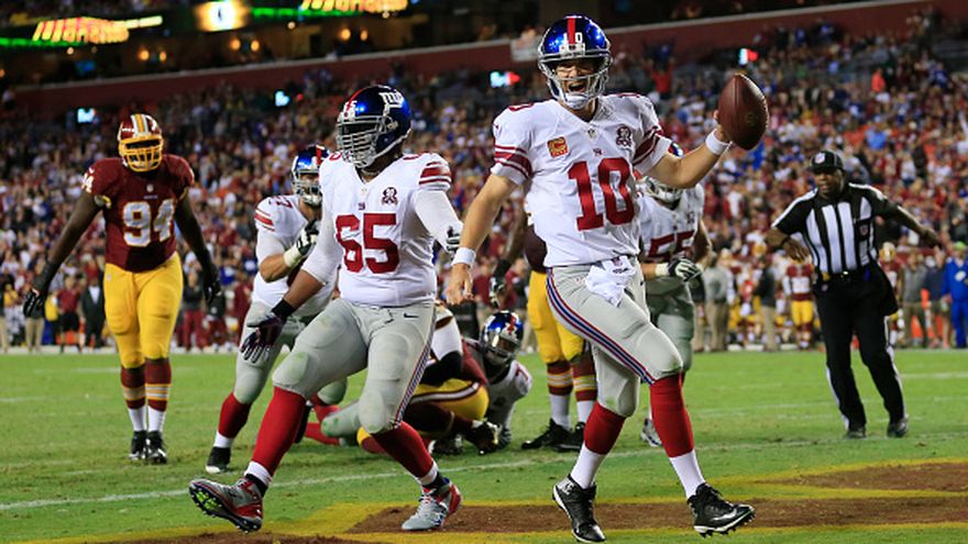 LANDOVER, Maryland, EE.UU. (AP) -- Larry Donnell atrapó tres de los cuatro pases de Eli Manning para touchdown y los Giants de Nueva York llegaron a los .500 de porcentaje al aplastar el jueves 45-14 a los Redskins de Washington. El tight end Donnell, en su segundo año en la liga, se apuntó un touchdown al entrar al partido. Concluyó con siete recepciones para 54 yardas. Manning completó 28 pases en 39 intentos para 300 yardas y tuvo un acarreo de una yarda que terminó en anotación. El quarterback pasó apuros en sus primeros dos partidos de la temporada al seguir las jugadas programadas por el nuevo coordinador ofensivo Ben McAdoo, pero ahora ha encabezado victorias consecutivas que han puesto a los Giants 2-2. La foja de los Redskins cayó a 1-3 bajo el nuevo entrenador Jay Gruden, y el equipo se encuentra en el sótano de la División Este de la Conferencia Nacional. Kirk Cousins fue responsable de cinco de los seis balones que perdió Washington: cuatro intercepciones y uno suelto. Los Giants anotaron 31 puntos a partir de esos errores de los Redskins.