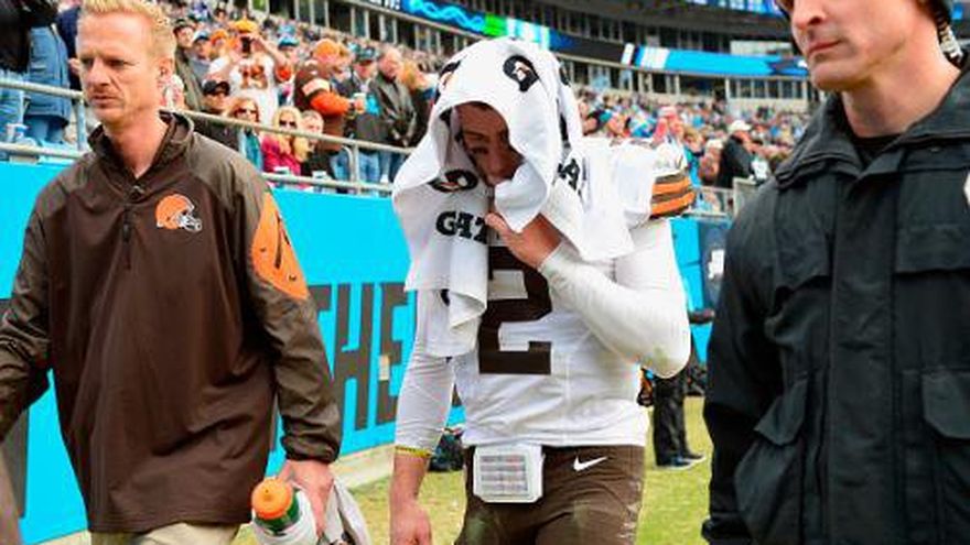 El quarterback de los Cleveland Browns Johnny Manziel salió del partido del domingo contra los Carolina Panthers tarde en la primera mitad por lo que fue descrito como una lesión en su corva. Su regreso al partido era cuestionable y Brian Hoyer tomó las riendas de la ofensiva para comenzar la segunda mitad. Manziel salió del túnel después del medio tiempo con una toalla sobre su cabeza. El profundo de los Pantehrs, Colin Jones, derribó a Manziel en una jugada de acarreo diseñana para el qauarterback. Manziel se paró tras la jugado, pero cayó de rodilla rápidamanete. El personal médico examinó la corva de Manziel por unos minutos mientras estaba tirado en el terreno y luego lo llevaron al camerino para más análisis justo antes de la pausa. Manziel completó 3 de 8 pases para 32 yardas. Aparentaba estar jugando mejor que su debut en la NFL la semana pasada. TEXTO: Jeremy Fowler (ESPN.com)