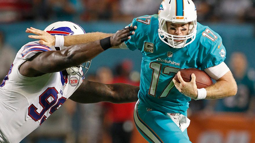 MIAMI GARDENS -- Ryan Tannehill tiró un pase de touchdown de 7 yardas para Brandon Gibson, y después conectó desde 8 yardas para anotación con Jarvis Landry, y los Miami Dolphins remontaron para llevarse una victoria por 22-9 sobre los Buffalo Bills el jueves por la noche. Las conexiones fueron apenas el tercer y cuarto touchdown ofensivos en la serie entre Miami y Buffalo después de ocho periodos de acción. Dan Carpenter convirtió tres goles de campo para Buffalo, incluyendo uno de 46 yardas con 6:26 por jugar en el cuarto periodo, pero erró uno en el cuarto final cuando tenía la oportunidad de empatar el juego a 12 puntos, después de un safety controversial en contra de los Bills. El mariscal de campo Kyle Orton --bajo presión de Olivier Vernon-- fue penalizado por pase intencionalmente lanzando desde las diagonales que puso arriba a Miami por 12-9. Pero en la patada libre subsecuente, Landry perdió el balón en el regreso y Buffalo tomó posesión en la yarda 39 de Miami. Ahí es cuando llegó la falla de Carpenter, después de que Orton y la ofensivamente nuevamente se quedaran sin conseguir el touchdown. Más tarde, Landry compensó su error con un touchdown de 8 yardas en el que estiró el ovoide para cruzar el plano imaginario de las diagonales. La anotación fue revisada por los oficiales, pero se confirmó la anotación. Los Dolphins usaron el uniforme aqua sobre aqua por primera vez desde el 2004.