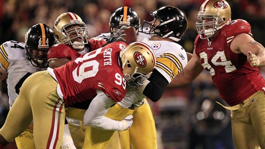 Los 49ers de San Francisco jugaron a oscuras el lunes en su regreso a la hora de máxima audiencia, apoyados nuevamente en lo mejor de su defensiva y a pesar de un par de apagones vencieron 20-3 al lesionado quarterback Ben Roethlisberger y a los Steelers de Pittsburgh. Vernon Davis atrapó un pase de touchdown de una yarda para los 49ers (11-3) una jugada después de conseguir una recepción de 21 yardas de Alex Smith. Frank Gore corrió para una anotación de cinco yardas y David Akers pateó goles de campo de 22 y 38 yardas para superar al integrante del Salón de la Fama Jerry Rice en el récord de anotaciones en una temporada para San Francisco. Los Steelers (10-4) perdieron una oportunidad clave para ocupar el primer lugar en la división norte de la Conferencia Americana y el primer sitio de los preclasificados a los playoffs de la Conferencia. Roethlisberger, jugando con un esguince en el tobillo izquierdo que tuvo a Big Ben en una bota caminando en la semana, lanzó dos intercepciones al inicio del partido y otra en los últimos minutos. Incluso todos los partidarios de los Steelers no pudieron ayudar a su equipo cuando su ventaja en el campo como locales se convirtió en dos retrasos por los apagones de energía.