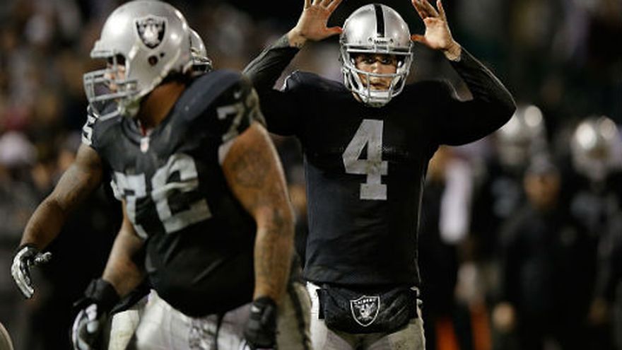 Después de mucho tiempo, el quarterback novato Derek Carr dio a los Raiders de Oakland un motivo para celebrar. Carr lanzó un pase de touchdown a James Jones cuando restaban 1:42 minutos de juego que permitió a Raiders cortar una racha de 16 juegos perdidos en forma consecutiva al vencer 24-20 a los Chiefs de Kansas City el jueves por la noche. "Pasé por momentos muy duros. Esas derrotas fueron dolorosas", dijo Carr. El running back de Oakland Latavius Murray consiguió dos touchdowns en cuatro acarreos antes de dejar el partido debido a una conmoción cerebral. Los Raiders (1-10) lograron una ventaja de 14 puntos pero Chiefs los alcanzó y tomó la ventaja en el cuarto periodo. Oakland necesitó de una serie que recorrió 80 yardas en 17 jugadas para lograr su primera victoria desde el 17 de noviembre de 2013, cuando vencieron a los Texans en Houston. Alex Smith lanzó dos pases de touchdown para los Chiefs, que habían ganado cinco partidos en fila; con la derrota quedaron medio juego atrás de Denver en la división Oeste de la Conferencia Americana Los Raiders se convirtieron en apenas el tercer equipo desde que la liga se fusionó en 1967 en vencer a una escuadra situada en el primer sitio luego de perder al menos 10 partidos para iniciar la campaña. Indianápolis lo hizo ante Green Bay en 1997 y Buffalo con Dallas en 1984. Los Chiefs tendrán mucho tiempo para pensar en esta derrota antes de recibir a los Broncos de Denver el 30 de noviembre en duelo por la cima del Oeste de la Americana. Raiders necesitó una serie impresionante del novato Carr para llevarse el partido. Tuvo que lanzarse dos veces con la pelota para mantener el avance y completó un pase de 6 yardas con Mychal Rivera en situación de tercera y seis por avanzar, además de aprovechar un castigo por interferencia contra Ron Parker en otra tercera oportunidad antes de encontrar a Jones en la zona de anotación para sellar el triunfo. "Fue una dura batalla, ellos son un gran equipo probablemente irán a la postemporada, hicieron grandes jugadas", dijo Carr. "No puedo esperar a ver las sonrisas de mis compañeros". El partido no se decidió sino hasta que Alex Smith lanzó un pase incompleto en cuarta oportunidad y 13 por avanzar en la yarda
