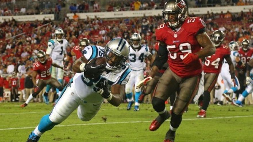 El quarterback Cam Newton está mostrando el mejor nivel de juego de su carrera, y unos mejorados Panthers de Carolina se encuentran sobre el promedio de .500 por primera vez en cinco años. Un eficiente Newton lanzó dos pases de touchdown y sumó otra anotación por tierra el jueves por la noche para vencer 31-13 a unos Buccaneers de Tampa Bay que no han ganado un solo partido esta temporada. Los Panthers (4-3) ganaron por cuarta ocasión en cinco juegos luego de un inicio de campaña de 0-2. Han ganado tres juegos consecutivos, con Newton lanzando para 667 yardas, seis touchdowns sin intercepciones. Los Buccaneers (0-7), uno de dos equipos de la NFL sin un triunfo esta temporada, han perdido los primeros siete partidos de una campaña por séptima ocasión en la historia de la franquicia. Newton completó 23 de 32 pases para 221 yardes. También cubrió 50 yardas terrestres en 11 intentos. El novato Mike Glennon lanzó para 275 yardas, un touchdown sin intercepciones en su cuarta apertura por Tampa Bay, que perdía 31-6 antes de cruzar finalmente la zona de anotación con una recepción de 10 yardas de Tim Wright a menos de tres minutos del final del partido.