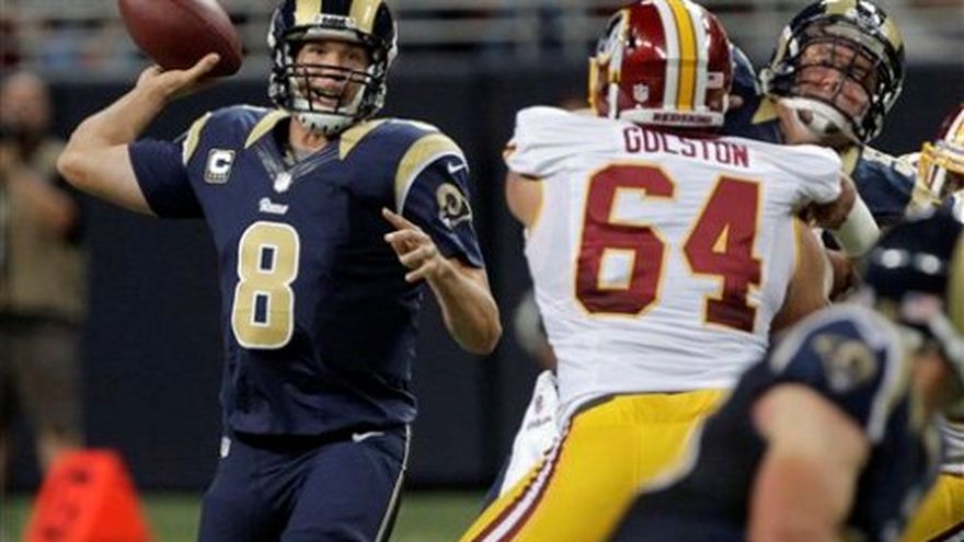 Sam Bradford lanzó para ganancia de 310 yardas y tres touchdowns, y Danny Amendola atrapó 16 pases que redituaron 160 yardas, con lo que los Rams de San Luis vencieron el domingo 31-28 a Robert Griffin III y los Redskins de Washington. Los Rams lograron el repunte después de que el entrenador Jeff Fisher dejó en la banca al running back Steven Jackson por recibir una sanción por conducta antideportiva en el segundo cuarto. Griffin condujo a los Redskins (1-1) a una ventaja de 21-6, pero los Rams (1-1) se recuperó gracias a las atrapadas de Amendola. El receptor empató una marca de la NFL con 12 pases atrapados en la primera mitad. Se llevó un pase de una yarda para touchdown que recortó la desventaja a 21-13 al ir al descanso. Bradford realizó en la segunda mitad pases para anotación de 34 yardas a Brandon Gibson y de una yarda a Matt Mulligan. Griffin corrió para dos touchdowns y dio un pase para una tercera anotación por Washington (1-1). Los Redskins tuvieron una última oportunidad después de que DeAngelo Hall recupero un balón perdido por el running back Daryl Richardson en la yarda 37 de Washington con 2:40 minutos por jugar. Billy Cundiff, empero, falló por mucho —demasiado a la izquierda y corto— un intento de gol de campo de 62 yardas con 1:13 minutos en el reloj.