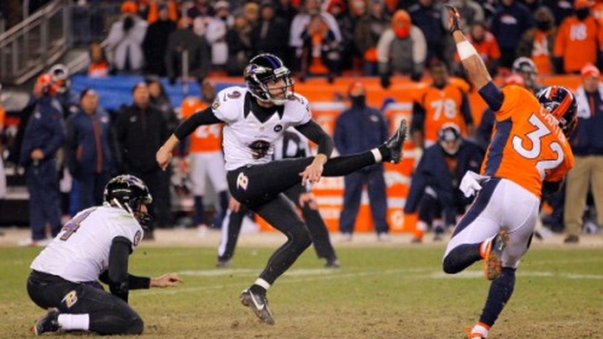 Justin Tucker pateó un gol de campo de 47 yardas en el segundo tiempo extra para catapultar a los Ravens de Baltimore a un triunfo el sábado 38-35 sobre los Broncos de Denver en los playoffs de la Conferencia Americana de la NFL. Los Ravens (12-6) forzaron la prórroga con un sensacional pase de touchdown de 70 yardas de Joe Flacco a Jacoby Jones cuando quedaban 31 segundos en el tiempo reglamentario, luego que Jones se abrió espacio entre un par de defensores de los Broncos cerca de la banda. En las postrimerías del primer tiempo extra, Peyton Manning lanzó incomodo en segunda oportunidad y Corey Graham se quedó con el balón para darle a los Ravens la posesión en la yarda 45 de Denver. Dos jugadas posteriores, el primer alargue llegó a su fin y los equipos cambiaron de dirección en el campo. Finalmente, luego de tres acarreos de Ray Rice por el medio, Tucker conectó su gol de campo por todo el medio entre los palos con 1:42 por jugar. Por el título de la conferencia y el pase al Super Bowl, a Baltimore le tocará visitar a Nueva Inglaterra o Houston el domingo de la próxima semana. Y esto significa que la carrera de su linebacker Ray Lewis tendrá un partido más antes del retiro.