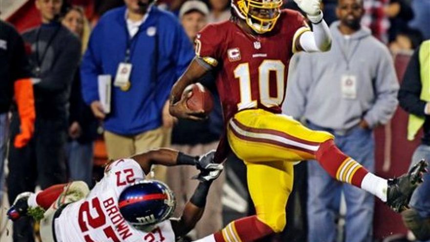 Robert Griffin III practicó el miércoles con los Redskins de Washington, tres días después de salir de un partido por un esguince en la rodilla derecha. El quarterback de primer año estuvo en el terreno de prácticas el miércoles, con su casco puesto, en la parte del entrenamiento que fue abierto a los periodistas. Griffin III participó en toda la rutina de estiramientos, y se movió sin problemas evidentes. Sin embargo, cojeó un poco durante los ejercicios de lanzar el balón. La estrella de los Redskins usó unos pantalones anchos que no permitieron ver si usaba alguna protección especial en la rodilla. Washington enfrenta el domingo a Cleveland.