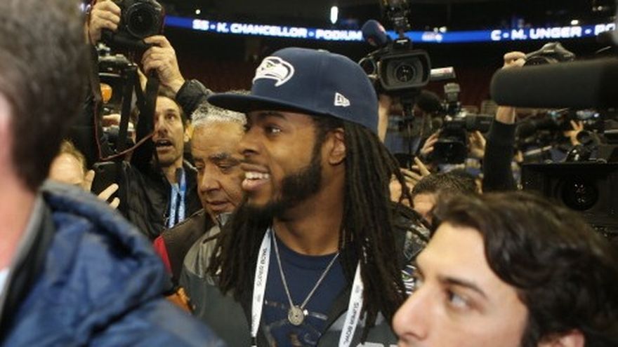 NEWARK, Nueva Jersey, EE.UU. (AP) -- Para sorpresa de nadie, Richard Sherman no podía esperar para empezar a hablar. Antes de que comenzara la hora asignada para hablar con los periodistas en el día de prensa de la NFL, el polémico cornerback comenzó a responder las preguntas desde un podio colocado a mitad de la arena de hockey en el centro de Newark. Cuando empezó a correr el tiempo oficial de la sesión de los Seahawks del martes, Sherman ya había contestado seis preguntas. Mostró una versión distinta a su vociferante declaración de 20 segundos luego del juego de campeonato de la Conferencia Nacional que generó un debate sobre deportivismo y actitudes raciales. Sherman fue divertido, encantador y nuca levantó la voz. Dijo que estaba feliz de tener una oportunidad para mostrar que es más que lo visto después de la jugada con la que su equipo aseguró la victoria contra San Francisco.
