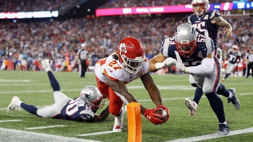 Gillislee, de 26 años, que las pasadas dos temporadas jugó con los Bills de Buffalo, adelantó de nuevo a los Patriots con otro acarreo anotador de 2 yardas en segundo cuarto, pero Kansas City se acercó con el segundo pase de anotación de la noche para Smith, con Hunt de protagonista.