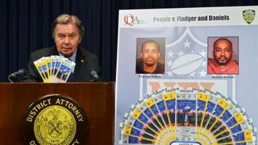 NUEVA YORK (AP) - Dos sujetos imprimieron boletos apócrifos para el Super Bowl y otros sucesos de la NFL, y los ofrecieron en venta mediante la internet, dijeron autoridades de Nueva York el martes, cinco días antes de que miles de aficionados concurran a un estadio cercano, en Nueva Jersey, para el gran partido. Damon Daniels, de 43 años y residente en Nueva York, así como Eugene Fladger, de 32 años y con domicilio en Filadelfia, esperaban el martes la audiencia en que se les notificarían los cargos en la Corte Penal de Queens. Fueron detenidos el lunes por las acusaciones de falsificación, posesión de artículos apócrifos y otros cargos relacionados con propiedad intelectual y marca registrada. No había información disponible de inmediato sobre si los sospechosos contaban con un abogado La policía recuperó 59 boletos apócrifos el lunes, en el apartamento de Daniels en Queens. Entre esas entradas había 36 para el Super Bowl, ocho para el aparcamiento del estadio, 12 para la fiesta de condecoración de la NFL en el Radio City Music Hall de Manhattan y tres para la fiesta del comisionado de la liga en el Hotel Waldorf-Astoria, dijo el teniente Chris Fasano, de la policía de Nueva York. Fasano encabezó la pesquisa tras recibir el mes pasado una pista de la división de seguridad de la NFL. De acuerdo con Fasano, la calidad de los boletos falsos era "muy buena", y una persona común no habría podido determinar que no eran auténticos. Agregó que las autoridades hicieron los arrestos esta semana, luego que la investigación las llevó a creer que la mayoría de los boletos falsos se vendería esta semana. Unos 40 boletos apócrifos, incluidos 20 para el Super Bowl, fueron comprados o reservados por las autoridades durante la investigación de unas seis semanas. Todas las entradas tenían impreso en relieve el logotipo de la NFL e incluían un código de barras diseñado para ingresar al estadio cuando se le verificara con un "escáner", dijeron los fiscales. La policía añadió que los sujetos vendieron los boletos mediante el sitio de anuncios clasificados Craigslist y luego los enviaron mediante FedEx, recibiendo los pagos a través de Western Union. Un portavoz de la NFL dijo que las personas que no compren boletos directamente a la NFL o a un equipo deben tener mucho cuidado.