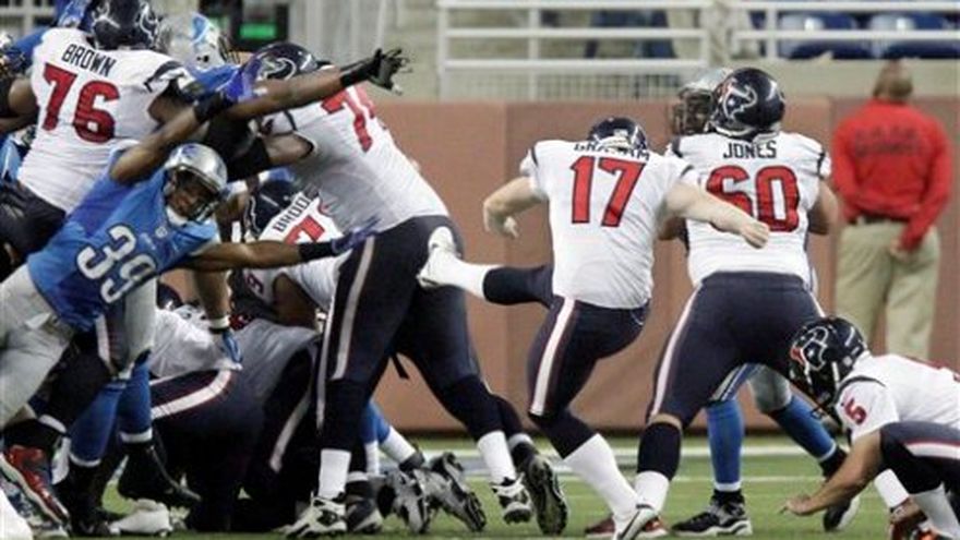 Un gol de campo de 32 yardas, convertido por Shayne Graham cuando restaban 2:21 minutos de la prórroga, permitió que los Texans de Houston vencieran el jueves 34-31 a los Lions de Detroit, cuyo entrenador cometió un costoso error en el tiempo regular, al infringir una regla de la NFL. El pateador de Detroit, Jason Hanson, tuvo la oportunidad de lavar el error de Schwartz, pero su intento de gol de campo, de 47 yardas en la quinta posesión del tiempo extra, pegó en el poste derecho y no entró. Schwartz desafió la decisión de los árbitros cuando Justin Forsett, de Houston, anotó en un acarreo de 81 yardas, en el tercer cuarto. Las repeticiones en video mostraron que la jugada había concluido cerca del medio campo, pero Schwartz impidió que la polémica se dirimiera mediante una revisión automática, y se le sancionó por conducta antideportiva. "Yo tuve la culpa", reconoció Schwartz ante sus asistentes y jugadores, a un costado de la cancha, mientras se daba unas palmadas en el pecho. Sí, lo fue. Ese touchdown que acercó a Houston a tres puntos resultó válido. Houston (10-1), líder de la División Sur de la Conferencia Americana, tomó la ventaja por primera vez cuando Graham se reivindicó de un gol de campo fallido, en una prórroga llena de balones perdidos. Los Texans han ganado cinco en fila —incluidos dos en tiempo extra. Y si un puñado de equipos pierde, Houston se meterá a los playoffs antes de que comience a entrenar para los encuentros de la próxima semana. Detroit (4-7) ha perdido tres encuentros en fila, con lo que se le complicó la misión de avanzar por segundo año consecutivo a los playoffs. No consigue ese boleto doble desde mediados de la década de 1990.
