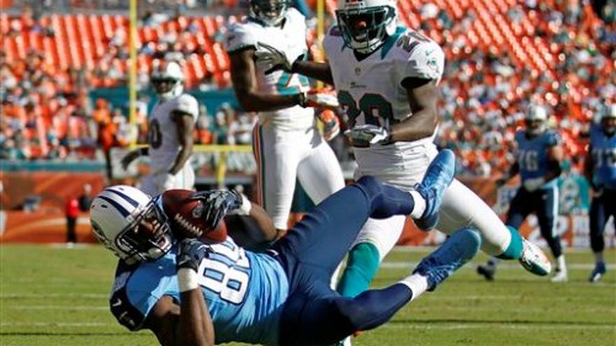 Colin McCarthy regresó una intercepción de pase 49 yardas para touchdown, y la defensa de los Titans de Tenesí arrebató cuatro balones, en un triunfo el domingo de 37-3 sobre los Dolphins de Miami. Los Titans llegaron al partido en ruta a establecer un récord para la NFL de puntos permitidos en una campaña, pero maniataron a Miami, interceptando a Ryan Tannehill tres veces y recuperando un balón perdido por Reggie Bush para un touchdown. Tenesí (4-6) se recuperó de una derrota de 51-20 la semana pasada contra los Bears de Chicago que causó la furia del dueño del equipo, Bud Adams. Para Miami (4-5), la derrota en casa fue la más abultada desde 1968. HUMILLACIÓN Andy Dalton fijó un récord personal con cuatro pases de touchdown, dirigiéndoles a receptores diferentes, y los Bengals de Cincinnati pusieron fin a una racha de cuatro derrotas con un resonante triunfo 31-13 sobre los Giants de Nueva York. Los Bengals (4-5) capitalizaron un balón suelto y dos pases interceptados a Eli Manning, que derivaron en un par de touchdowns en el tercer cuarto. La segunda derrota en fila de los Giants (6-4) acentúa las interrogantes en torno al equipo, sobre todo en su ofensiva. Pero les caerá bien tener descanso en la próxima fecha. Manning completó otro partido flojo, sin emular a su hermano mayor Peyton ante los Bengals. Una semana atrás, Peyton lideró a los Broncos en el mismo estadio a una victoria 31-23 para dejar en 8-0 su marca personal ante los Bengals. Los Giants perdieron cuatro veces el balón.