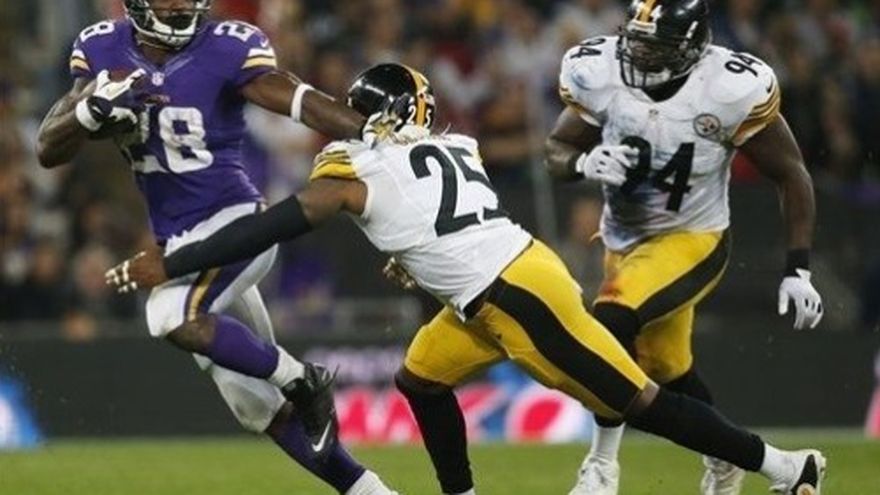 Greg Jennings realizó dos atrapadas de touchdown, Adrian Peterson corrió para dos anotaciones, y la defensiva de los Minnesota Vikings realizó una gran detención cuando se agotaba el tiempo para preservar una victoria por 34-27 sobre los Pittsburgh Steelers este domingo para su primer triunfo del año. Jugando en Wembley Stadium, Everson Griffen zafó el ovoide a Ben Roethlisberger en la yarda 6 con 19 segundos por jugar. Kevin Williams recuperó para sellar el triunfo. Jennings realizó una atrapada de 70 yardas hasta el touchdown y Peterson tuvo una escapada anotadora de 60 yardas que ayudaron a a compensar dos touchdowns del corredor novato de Pittsburgh, Le"Veon Bell, y dar a Minnesota (1-3) algo de esperanza de poder darle rumbo a su campaña. Los Steelers cayeron a marca de 0-4 por primera vez desde el 1968. El mariscal de campo de los Vikings, Matt Cassel, iniciando en lugar del lesionado Christian Ponder, finalizó con 16 completos de 25 intentos para 248 yardas y dos touchdowns. Roethlisberger completó 36 de 51 envíos para 383 yardas, con un touchdown y una intercepción.