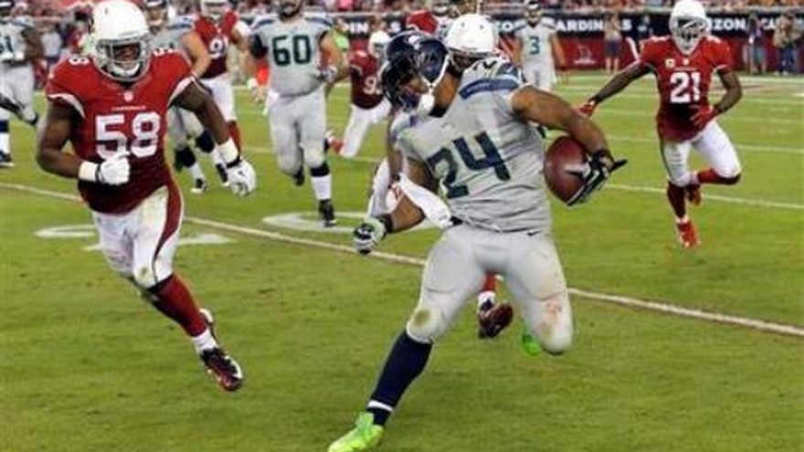 Los Seahawks de Seattle dominan la División Oeste de la Conferencia Nacional, y el partido del jueves en Arizona ofreció la más reciente evidencia de ello. Russell Wilson lanzó tres pases de anotación, Marshawn Lynch acumuló 91 yardas por tierra y los Seahawks doblegaron 34-22 a los Cardinals de Arizona. "Esta fue realmente una noche genial para nuestro equipo", dijo Pete Carroll, de los Seahawks. "Queríamos jugar fuera de casa, lograr este resultado y seguir sintiéndonos bien sobre nuestra capacidad de ganar como visitante". Los Seahawks (6-1) interceptaron dos de los pases de Palmer, y convirtieron ambos regalitos en anotaciones. Además, capturaron siete veces al mariscal, dos a cargo de Chris Clemons, quien estaba en duda para el partido por una hiperextensión en un codo. Arizona (3-4) hizo un touchdown y convirtió uno de sus tres goles de campo después de que Wilson soltó el balón dos veces, tras ser capturado en territorio de Seattle. Palmer ha visto interceptados 11 de sus envíos en los últimos cinco partidos y 13 en esta temporada. Es segundo, sólo detrás de los 15 que ha sufrido Eli Manning. Seattle propinó a los Cardinals su séptima derrota consecutiva contra un rival de la División Oeste de la Conferencia Nacional. "Sabíamos que necesitábamos lucir grandiosos", dijo Palmer, "y no lo fuimos tanto esta noche". Wilson completó 18 de 29 pases para 235 yardas, con pases de touchdown de 31 yardas a Sidney Rice, 15 yardas a Zach Miller y una yarda a Kellen Davis. Por segundo juego consecutivo, Wilson no sufrió intercepción. "Los receivers hicieron un buen trabajo manteniéndose con vida", dijo Wilson. "Patrick Peterson es uno de los mejores cornerbacks de la liga y los chicos lograron hacer jugadas contra él".