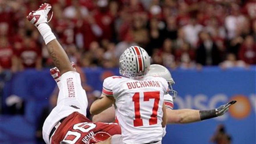 Terrelle Pryor lanzó dos pases para touchdown y Solomon Thomas logró una intercepción con 58 segundos restantes para sellar el triunfo de Ohio State el martes por 31-26 ante Arkansas en el Sugar Bowl. Pryor y Thomas fueron algunos de los cinco jugadores de Ohio State a los que se acusó de violar las reglas de la NCAA, la asociación nacional de atletismo universitario de Estados Unidos, al vender artículos de recuerdo y obtener descuentos para tatuajes, justo antes de que los Buckeyes (12-1) se dirigieran a Nueva Orleáns. Al final Ohio State necesitó que todos participaran en el juego para poder derrotar a un equipo de la Conferencia del Sureste por primera vez en un bowl. Los Buckeyes habían perdido sus nueve compromisos de postemporada anteriores ante la SEC. Otros de los jugadores sancionados fueron Dan Herron y DeVier Posey, que anotron cada uno un touchdown. Pero Thomas, el único sustituto entre ellos, logró la mejor jugada de todas. Arkansas (10-3) tuvo la oportunidad de lograr una ofensiva casi imposible cuando Colton Miles-Nash saltó sobre dos linemen para bloquear una patada de despeje, con lo que los Razorbacks avanzaron a la línea de 18 yardas de Ohio State con 1:09 minutos restantes. Pero Thomas sorprendió a Ryan Mallett al cubrirlo desde su posición de defensive end. Mallett nunca lo vio y Thomas completó la intercepción para lograr el triunfo.