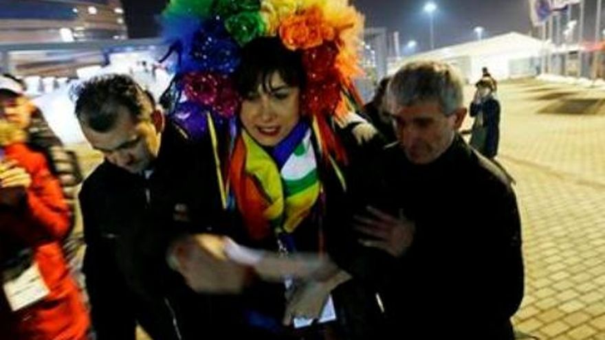 Rusia (AP) -El Comité Olímpico Internacional defendió el retiro a la fuerza de una italiana transexual defensora de los gays de un estadio de Sochi al afirmar que "se le escoltó para salir de ahí de manera pacífica" y que no fue detenida. Vladimir Luxuria, exlegisladora del parlamento italiano, fue sacada de la arena donde se disputa el hockey femenino la noche del lunes. Cuatro hombres no identificados hicieron que Luxuria entrara en un automóvil con los símbolos olímpicos. Vestida con los colores del arcoíris, Luxuria pasó casi dos horas caminando por el Parque Olímpico, acompañada por un grupo de reporteros. La mayoría de los espectadores rusos no entendían sobre el mensaje de derechos de los gays y algunos se le acercaron para sacarse una foto, creyendo que era un personaje cómico. Luxuria informó a The Associated Press que estuvo en el auto durante 10 minutos y que le dejaron salir a las afueras de la ciudad, después que le quitaron el pase de espectador de los juegos. El portavoz del COI Mark Adams dijo el martes que "lo ocurrido ayer aún no está del todo claro", pero Luxuria acudió al Parque Olímpico con el fin de protestar. Añadió que el Parque Olímpico y que las demás sedes no son el sitio ideal para manifestaciones. "Le pedimos que lo hagan en otro sitio". El COI tiene reglas bien estrictas contra protestas y actos de propaganda en las sedes de los juegos. Según el COI, permitir que alguien exhiba mensajes no vinculados a los juegos estimulará que otros empleen las olimpiadas como fin de promover sus causas.