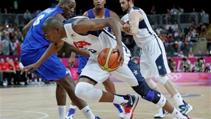 Kevin Durant anotó 15 de sus 22 puntos en una explosiva primera primera mitad y fue la bujía para que Estados Unidos solventara con una victoria 98-71 sobre Francia su debut el domingo en el básquetbol de los Juegos Olímpicos. Durant acertó seis de sus 13 tiros al aro y atrapó nueve rebotes para los estadounidenses, que ratificaron el favoritismo que derrochan para revalidar el oro que consiguieron en Beijing 2008. Kevin Love fue el segundo mejor anotador de Estados Unidos con 14 unidades, mientras que Kobe Bryant sumó 10. LeBron James se acopló como distribuidor. Tomó seis tiros y anotó nueve puntos, pero repartió ocho asistencias con cinco rebotes. Estados Unidos, que quedó así en la cima del Grupo A con Nigeria, se las verá el martes con Túnez. Los estadounidenses, que ahora suman 18 triunfos consecutivos en torneos internacionales, van por su 14ta presea dorada en el básquetbol masculino. Tony Parker, usando unos lentes especiales para proteger una lesión en el ojo que sufrió previa a los juegos, convirtió sólo cuatro de 11 disparos y terminó con 10 puntos y cuatro entregas de balón. Ali Traore fue el mejor francés con 12 puntos. El encuentro inicio , con una Francia oponiendo resistencia gracias a los esfuerzos individuales de Parker y Ronny Turiaf, quienes se combinaron para anotar 11 puntos en el primer periodo en el que un momento lograron estar cuatro puntos abajo. Pero los estadounidenses salieron más agresivos para el segundo cuarto y con una acometida 11-3, sellada con un triple de Chris Paul, se distanciaron 33-21 y ya no miraron atrás. Se fueron al descanso con ventaja 52-36. Para el tercer cuarto, un par de encestes consecutivos de Love ampliaron hasta 25 puntos la ventaja para poner la pizarra 76-51 y un par de libres de Durant pusieron un 80-51 al inicio del último cuarto. En ese momento, el entrenador Mike Krzyzewski realizó varios cambios. Durant y resto de los titulares se quedaron en la banca y entraron suplentes. Uno de ellos fue el novato Anthony Davis, primera selección en el último draft de la NBA. Al final del partido, los jugadores estadounidenses saludaron a la primera dama Michelle Obama, quien estuvo en primera fila para presenciar el triunfo.