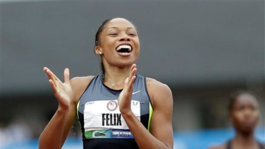 Allyson Felix cruzó la meta en 21,69 segundos, el mejor tiempo de su vida, para ganar el sábado la final de los 200 metros planos en el preolímpico de atletismo de Estados Unidos. "Yo sabía que ella iba a ser veloz", dijo su entrenador Bobby Kersee. "Pero no sabía que iba a volar así. Fue muy, muy impresionante". Carmelita Jeter finalizó 0,42 segundo detrás, y Sanya Richards-Ross fue tercera, para completar el trío representando a Estados Unidos en las Olimpiadas de Londres. Jeter ya estaba en el equipo, pues ganó los 100 metros, y Richards-Ross ganó los 400. Ahora falta por determinar si Felix va a competir en los 100 metros en Londres, tras finalizar empatada en tercero con Jeneba Tarmoh, su compañera de entrenamientos, el sábado pasado. Ambas pudieran definirlo en una carrera. O Felix simplemente pudiera ceder el puesto a Tarmoh, porque ella ya va en los 200 y Tarmoh finalizó quinta en esa prueba. En los 110 con vallas para hombres, Aries Merritt logró el mejor tiempo del año en el mundo, 12,93 segundos, para ganar la prueba en el preolímpico. Jason Richardson, campeón mundial reinante, fue segundo con 12,98 y Jeffrey Porter tercero, con 13,08, para completar el equipo.