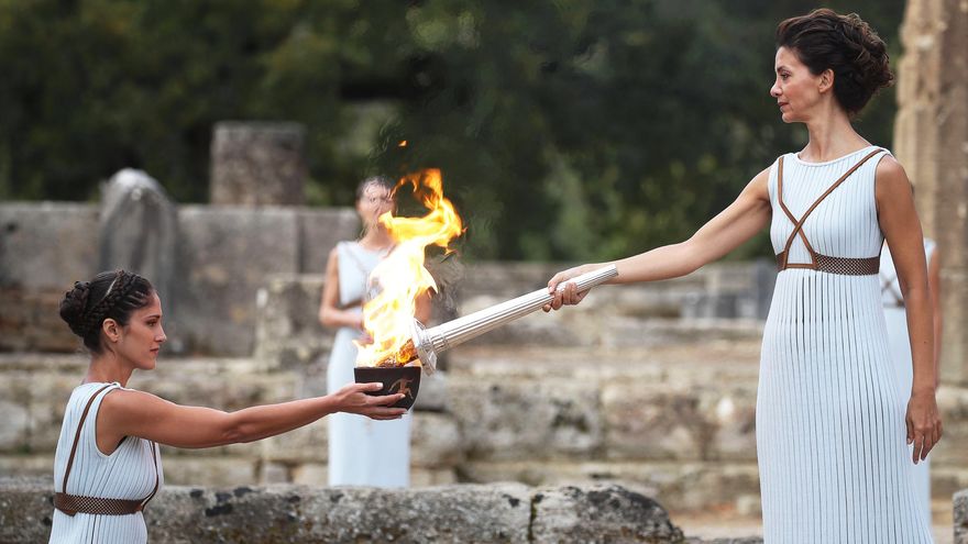 Katerina Lehou, la actriz griega que actuó como la gran sacerdotisa con un largo vestido tradicional, necesitó tres intentos para iluminar la llama.