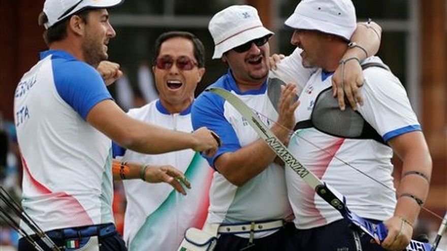 Italia ganó el sábado un apretado duelo frente a México en las semifinales, y luego se impuso incluso por menos diferencia ante Estados Unidos, para apoderarse de la presea dorada por equipos, en el tiro con arco de los Juegos Olímpicos de Londres. En la final, Italia triunfó por un solo punto a Estados Unidos, en la última flecha. La plata conseguida por los estadounidenses significó su primera presea en Londres 2012. Corea del Sur se quedó con el bronce. Michele Frangilli, Marco Galiazzo y Mauro Nespoli se abrazaron y levantaron los brazos para celebrar después de que su última flecha hizo posible la victoria por 219-218 sobre los estadounidenses, en el Lord"s Cricket Ground. Italia jamás había conquistado una medalla de oro en el tiro con arco. México tuvo que conformarse con el cuarto lugar. Juan René Serrano, Luis Vélez y Luis Alvarez perdieron 217-215 ante Italia en las semifinales y luego cayeron por 224-219 contra Corea del Sur al jugarse el bronce. Serrano reconoció que una mala ejecución contra los surcoreanos, al dar en el blanco 5 al inicio de la competencia, les costó muy caro. Explicó que se le atoró un gancho en el arco. "Tuve un poco de problemas para poder sacar la flecha, el tiempo se me agotaba y la tuve que soltar y bueno se me fue la flecha", dijo.