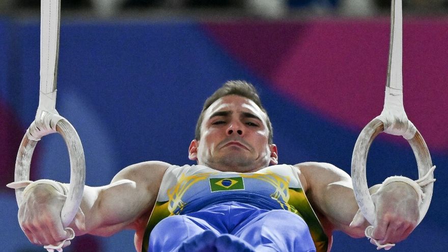 Tras una vuelta, los músculos se tensan y acomoda el cuerpo en una vertical sobre las anillas. Instantes después, el brasileño Arthur Zanetti pierde el equilibrio con una debilidad en los brazos que provoca el balanceo de sus piernas.