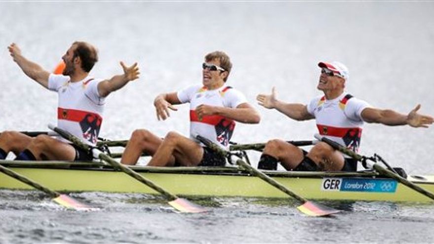 Alemania derrotó el viernes a la favorita Croacia y conquistó el oro en la regata de cuatro pares de remos cortos para hombres en los Juegos Olímpicos de Londres, durante una jornada que le deparó otra presea dorada a las remeras locales y dos a Nueva Zelanda. La tripulación alemana, formada por Kark Schulze, Phillipp Wende, Lauritz Schoof y Tim Grohmann, tuvo la punta de principio a fin y se llevó la victoria en un tiempo de cinco minutos, 42.48 segundos. Croacia llegó atrás por un largo, para quedarse con la plata, luego de mostrarse incapaz de remontar la distancia. Australia se embolsó el bronce en esta prueba, conocida también como "cuádruple scull". Los australianos ganaron el mundial de 2011, pero tanto ellos como los alemanes habían sido eclipsados este año por los croatas, que ganaron las tres regatas de la Copa Mundial de 2012 y se clasificaron como los más rápidos a la final olímpica. Fue el segundo oro de Alemania en el remo de Londres 2012, luego de conquistar también la modalidad de ocho remos largos con timonel, considerada la prueba reina de este deporte. Alemania, que largó por el sexto carril tras un cambio en la ubicación por los intensos vientos matutinos, tomó casi un segundo de ventaja sobre Croacia a la mitad de la competición. En la línea de los 1.500 metros, la diferencia se había ampliado a 1.9 segundos y los alemanes tenían prácticamente el oro colgado al cuello. Schoof y Schulze se pusieron de pie después de cruzar la meta, batieron puños en el aire y se mostraron jubilosos, tras una ventaja de 2.3 segundos sobre los croatas. La embarcación croata, tripulada por David Stain y Damir Martin, así como por los hermanos Martin y Valent Sinkovic, parecía en condiciones de dar a su país la primera presea de oro en remo desde que se independizó en 1991. También el viernes, la británica Katherine Grainger consiguió al fin el oro olímpico, en su cuarto intento, al triunfar en el par de remos cortos junto a Anna Watkins. Las anfitrionas, que eran favoritas, ganaron por más de un largo, con un registro de 6:55.82. Australia logró la plata y Polonia el bronce. Grainger lloró después de conseguir la plata en el "cuádruple scull" en Beijing 2008, sus terceros olímpicos en los que quedó segunda. Pero desde 2010, cuando formó dupla con Watkins, no ha perdido una regata. En las eliminatorias, ambas le descontaron casi cinco segundos al récord olímpico. Fue el segundo oro de Gran Bretaña en el remo. Helen Glover y Heather Stanning triunfaron el miércoles en el par de remos largos para mujeres. En la regata de par de remos largos, los neocelandeses Hamish Bond y Eric Murray mantuvieron viva su racha invicta de tres años y se apoderaron del oro. Bond y Murray hicieron un tiempo de seis minutos, 16.65 segundos. Francia quedó a dos largos para obtener la plata, y el bronce tuvo como destinataria a la tripulación británica. La dupla "kiwi" no ha perdido una regata desde que comenzó a formar equipo, después de los Juegos Olímpicos de Beijing, en los que fueron parte de una embarcación de cuatro pares de remos cortos que no llegó a la final pese a que se le consideraba favorita. El último triunfador de la jornada fue el neocelandés Mahe Drysdale, que se impuso en el "scull individual" (par de remos cortos) para enriquecer su currículum como uno de los mejores de la actualidad. Drysdale, cinco veces campeón mundial, superó a su rival acérrimo, el checo Ondrej Synek, para lograr un tiempo de 6;57.82 minutos. Synek se quedó media embarcación atrás para quedarse con la plata, y el británico Alan Campbell obtuvo el bronce.