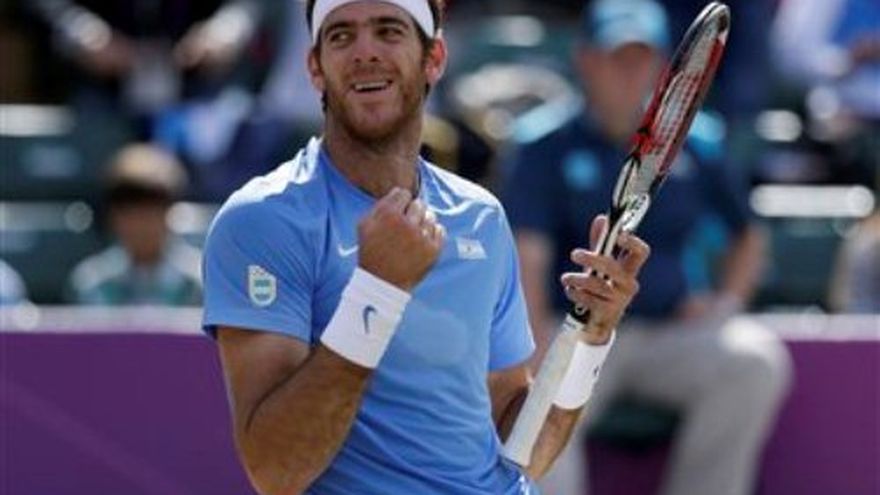 Juan Martín del Potro logró el domingo el bronce olímpico en el torneo de tenis masculino y dio a Argentina su primera medalla en los Juegos de Londres. Del Potro se impuso al serbio Novak Djokovic, número dos del mundo, por 7-5, 6-4. Fue la primera medalla de la historia del tenis argentino en singles masculino y la segunda en el computo total de los varones, tras el bronce conquistado en Barcelona 1992 por los doblistas Javier Frana y Cristian Miniussi. Djokovic, bronce en Beijing 2008, no pudo repetir metal en Londres. Del Potro había ganado sólo una vez en cinco enfrentamientos previos con Djokovic, en las semifinales de la Copa Davis de 2011, en las que el serbio se retiró en el segundo set por lesión. Pero en Londres y sobre la hierba de Wimbledon, la historia fue diferente. La suerte del primer set pudo cambiarla el llanto de un bebé. El partido discurrió muy igualado con poco juego y mucho dominio de los servicios. Con 5-4 para el serbio y 15-30 a su favor cuando sacaba Del Potro, un niño rompió a llorar en mitad de un intenso peloteo y Djokovic pareció perder la concentración y erró una derecha aparentemente sencilla. De buen humor, se ofreció a acunar al bebé, que abandonó la cancha en brazos de su padre y entre los aplausos del público. Más allá de la anécdota, el serbio encadenó en ese momento varios errores, comenzó a quejarse airadamente de sus fallos, dedicó varios de sus habituales aspavientos y gritos de desaprobación y Del Potro consiguió quebrar en el undécimo game y disponer de servicio para anotarse la manga. Fue el mejor game del partido, en el que el argentino consiguió llevarse el set a la tercera oportunidad gracias a un excelente servicio sobre los 200 kilómetros por hora que Djokovic no pudo devolver. El segundo set mantuvo la misma tónica. Con un Djokovic errático, Del Potro quebró en el tercer game. En el octavo, Djokovic dispuso de una opción de quebrar para meterse de vuelta en el partido, pero Del Potro salvó el peligro con una grandiosa derecha a la línea, un potente servicio y otra derecha cruzada sobre el revés de Djokovic inalcanzable para el serbio. Del Potro mató el partido con un potente primer servicio y se derrumbó sobre el césped para celebrar el triunfo envuelto en la bandera de Argentina.