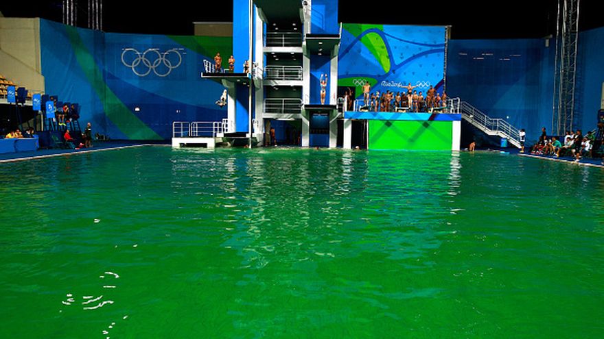 El color de la piscina era extrañamente verdoso, cambió de un día para otro, pero no impidió que se realizara la competencia olímpica de clavados sincronizados femenino de plataforma a 10 metros este martes, en la que la dupla mexicana no pudo defender su lugar en el podio.