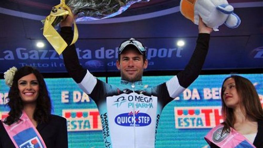 El velocista Mark Cavendish ganó el jueves la duodécima etapa del Giro de Italia, para llegar a 100 etapas ganadas en su carrera, mientras que Vincenzo Nibali conservó la maglia rosa de líder general. El campeón del Tour de Francia, Bradley Wiggins, quedó prácticamente fuera de contienda al llegar a tres y medio minutos del pelotón general. El británico enfrenta problemas con una infección respiratoria, y hay posibilidades de que se retire antes de la próxima etapa. Rigoberto Urán, compañero colombiano de Wiggins en el equipo Sky, conservó el tercer lugar en la clasificación general, a 2:04 de Nibali. El oriundo del municipio de Urrao, en la región de Antioquia, arribó 53ro en la lluviosa etapa del jueves, junto con el pelotón general. Cavendish cronometró 3 horas, 1 minuto, 47 segundos en el recorrido de 134 kilómetros desde Longarone hasta Treviso, que comenzó con unas cuantas colinas y terminó con un circuito plano. Fue la tercera victoria de Cavendish en el Giro de este año. El integrante del equipo Omega Pharma-Quick Step también ganó la primera y sexta mangas. Cavendish ha ganado 39 etapas en el Giro, el Tour y la Vuelta a España, las tres pruebas más importantes del ciclismo mundial. "No podía esperar a conseguir mi triunfo 100, y estoy muy contento por haberlo logrado aquí en el Giro", dijo Cavendish. El francés Nacer Bouhanni y el esloveno Luke Mezgec cruzaron la meta segundo y tercero, respectivamente, ambos con el mismo tiempo que el ganador. En la general, Nibali conservó su ventaja de 41 segundos sobre el australiano Cadel Evans, campeón del Tour en 2011. Wiggins cayó del cuarto al 13er puesto, a 5:22 de Nibali. "Urán está pedaleando fantástico", comentó Nibali. "La clasificación está muy cerrada y Evans está ahí". La décimo tercera etapa del viernes es la más larga, una ruta mayormente plana de 254 kilómetros desde Busseto hasta Cherasco, con unas cuantas colinas justo antes de la meta. La carrera culmina el 26 de mayo en Brescia.