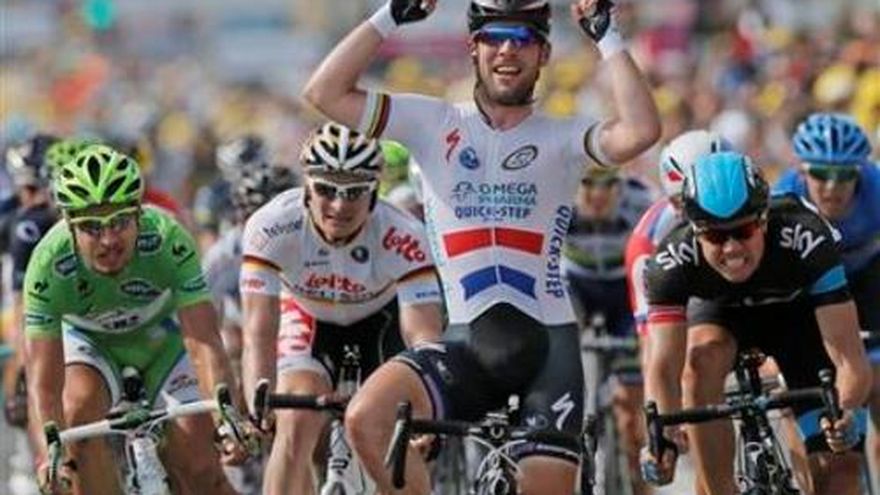 El velocista británico Mark Cavendish se apoderó el miércoles de la quinta etapa del Tour de Francia en un embalaje vertiginoso, mientras el veterano australiano Simon Gerrans mantuvo la casaca amarilla de puntero en la general. Cavendish había tenido un comienzo relativamente flojo en el Tour, pero su vigésima cuarta victoria en una etapa de la máxima competencia del ciclismo internacional seguramente elevará su confianza. Los punteros buscaron su mejor colocación en la recta final y faltando unos pocos centenares de metros Cavendish obtuvo una posición perfecta para atacar y resistir los embates del noruego Edvald Boasson Hagen, que llegó segundo. Tercero fue Peter Sagan, que ostenta la casaca verde al mejor velocista. Cavendish necesita una victoria más en una etapa para empatar con Andre Leducq el tercer puesto en la lista histórica de ganadores de etapas, y podría hacerlo el jueves ya que la sexta etapa favorece a los velocistas. Después podría ir detrás de los 28 triunfos en etapas de Bernard Hinault, y los 34 del récordman Eddie Merckx. Mientras el vencedor levantaba los brazos en señal de triunfo, detrás de él una docena de ciclistas cayeron en un choque múltiple. También hubo otro choque un poco antes que afectó de 15 a 20 corredores. El tramo de 228,5 kilómetros (142 millas) incluyó algunas escaladas menores pero por lo demás fue sobre terreno plano. Empezó en el balneario de Cagnes-sur-Mer y terminó en el puerto de Marsella. Gerrans resistió el embate de Sagan para ganar la tercera etapa del lunes y ayudó a Orica Greenedge a ganar la contrarreloj por equipos el martes en tiempo récord. Gerrans es el sexto australiano que luce la casaca amarilla. El japonés Yukiya Arashiro y el francés Kevin Reza formaron parte de un grupo de seis ciclistas que se desprendieron temprano durante la etapa. Ninguno de ellos ha ganado jamás una etapa en el Tour, de modo que el pelotón los dejó alejarse. Llegaron a sacar una ventaja de más de 10 minutos, que se redujo a ocho cuando el pelotón alcanzó el comienzo de la tercera pequeña escalada del día. En un terreno de pocas dificultades y ya oscurecido, la velocidad promedio de las primeras cuatro horas era de apenas 40 kilómetros (25 millas) por hora. Faltando poco más de 50 kilómetros (31 millas) para la meta, tres del grupo puntero -Arashiro, Alexey Lutsenko de Kazajistán y Thomas De Gendt de Bélgica- se desprendieron de los otros tres. Sobre el final, al igual que en la primera etapa del sábado, hubo un choque a 15 kilómetros (9 millas) de la llegada. Pareció que Brent Bookwalter, de BMC, que estaba en la mitad izquierda del pelotón, fue el primero en caer y provocó el entrevero. La sexta etapa del jueves es un tramo plano de 176,5 kilómetros (110 millas) entre Aix-en-Provence y Montpellier. La carrera entra en las montañas por primera vez en la octava etapa del sábado.