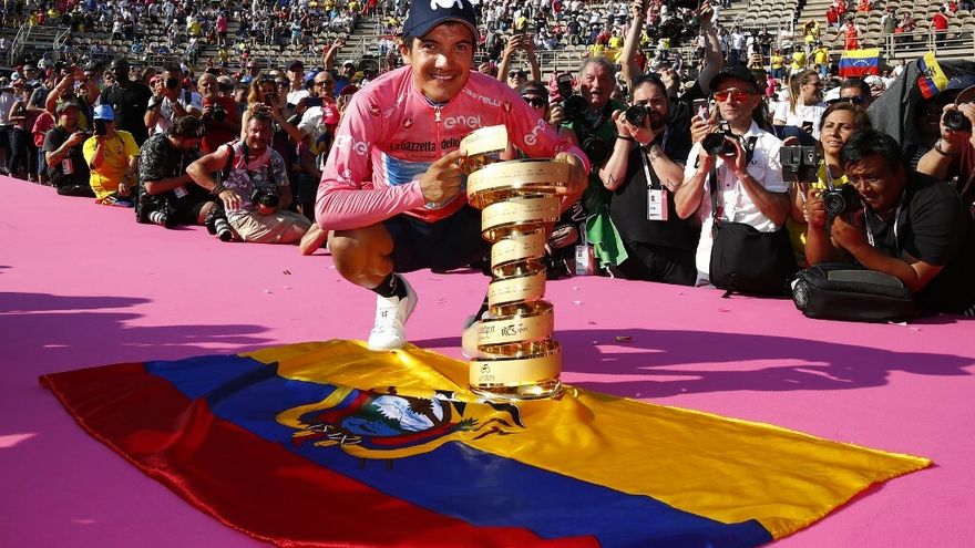 El ecuatoriano Richard Carapaz (Movistar) conquistó este domingo a los 26 años el Giro de Italia, su primera grande, al término de una contrarreloj por Verona ganada por el estadounidense Chad Haga (Sunweb).