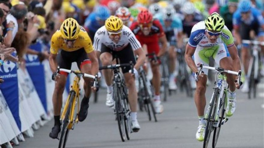 El eslovaco Peter Sagan ganó el domingo la primera etapa del Tour de Francia y el suizo Fabian Cancellara retuvo la camiseta amarilla del líder después de que se llevó el prólogo la víspera. El británico Bradley Wiggins y el campeón defensor Cadel Evans, ambos candidatos a llevarse el título, se mantuvieron cerca del líder en el pelotón tras el recorrido de 198 kilómetros (123 millas) desde Lieja hasta Seraing, el cual cuenta con cinco ascensos de poca pendiente.