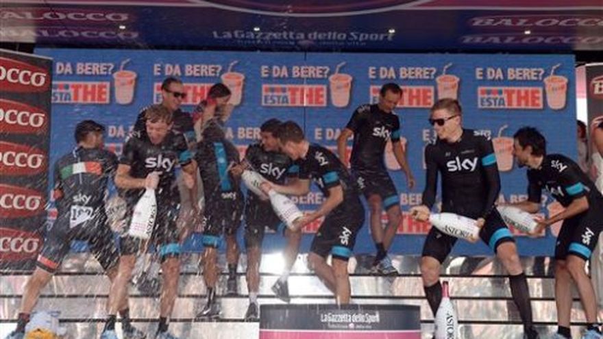 Bradley Wiggins, el vigente campeón del Tour de Francia, guió el domingo al Sky a una victoria en la contrarreloj por equipos en la segunda etapa del Giro de Italia y se colocó en segundo lugar en la tabla. Salvatore Puccio, compañero de equipo de Wiggins, se apoderó de la camiseta rosa de líder. Los colombianos Sergio Henao y Rigoberto Urán, integrantes del Sky, se colocaron en el tercero y quinto puesto de la clasificación general, respectivamente. Sky finalizó con tiempo de 22 minutos y 5 segundos a lo largo de la pintoresca ruta de 17,4 kilómetros (10,8 millas) en la isla de Ischia. Movistar fue segundo, 9 segundos detrás. Astana, con el italiano Vincenzo Nibaldi —el principal adversario de Wiggins— fue terdero, 14 segundos detrás. El italiano Dario Cataldo fue el primer ciclista de Sky en cruzar la meta, pero su compatriota Puccio se llevó la camiseta rosa porque tuvo una mejor posición en la primera etapa el sábado. "Es un poco inesperado, pero estoy contento de tenerla", dijo Puccio. El equipo Omega Pharma-Quick Step, del ganador de la primera etapa, Mark Cavendish, finalizó 17mo, 48 segundos detrás de Sky. El equipo acusó la ausencia del especialista en contrarreloj Tony Martin, que no compite en el Giro. Wiggins, el británico que siguió su triunfo en el Tour con una medalla de oro en la contrarreloj en las Olimpiadas de Londres el año pasado, tiene el mismo tiempo que Puccio en la tabla general. Wiggins ganó 14 segundos sobre Nibali y 25 sobre el campeón defensor, el canadiense Ryder Hesjedal. "Fue una buena actuación de nuestro equipo", dijo Nibali. "No somos especialistas en contrarreloj — la mayoría de nosotros somos mejores en montaña — así que esto estuvo bien". Otros contendientes, incluyendo el ganador del Tour 2011, Cadel Evans, y el campeón olímpico de 2008, Samuel Sánchez, perdieron más tiempo con sus equipos. La etapa se realizó en medio de condiciones perfectas, en una ruta con dos difíciles ascensos en la segunda mitad. Los ciclistas llegaron a la isla napolitana por transbordador el domingo por la mañana y regresaban a la península inmediatamente tras la etapa. El Giro seguirá en la región de Nápoles para la tercera etapa el lunes, un recorrido montañoso y largo de 222 kilómetros (138 millas) desde Sorrento hasta marina di Ascea a lo largo de la costa de Amalfi.