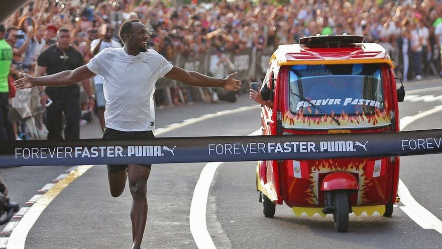 La leyenda del atletismo Usain Bolt participó este martes en una colorida carrera de exhibición contra una mototaxi, apenas horas después de llegar a Lima para promover una línea de ropa deportiva.
