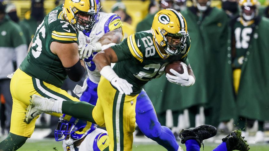A.J. Dillon trajo el calor en el gélido Lambeau Field en Green Bay, corriendo para dos touchdowns para los ´Empacadores´.