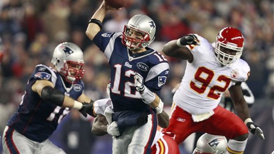 Rob Gronkowski giró y cayó de cabeza en la zona de anotación, se tambaleó y aún así logró arrojar el balón contra el césped. "Me hallaba bien", dijo el tight end estelar de los Patriots. "Fue solo que el viento me golpeó un poco". Tom Brady completó dos pases de touchdown con Gronkowski y los Patriots de Nueva Inglaterra se repusieron de un comienzo flojo para apalear el lunes por 34-3 a los Chiefs de Kansas City. Julian Edelman regresó una patada 72 yardas para un touchdown y Kyle Arrington tuvo dos intercepciones para apoyar también a los Patriots (7-3) a incrementar su ventaja en la División Este de la Conferencia Americana a dos juegos. "Tratamos de ser una defensiva muy oportunista", dijo Arrington, "y cuando jugadas como esta se presentan por sí solas, uno tiene que capitalizarlas. Y si además logro llegar hasta la zona de anotación en una de esas veces, sería muy bueno". No se esperaba que los Chiefs (4-6) tuvieran una gran ofensiva con el quarterback Tyler Palko en el primer partido como titular en su carrera, debido a que Matt Cassel está lesionado. Y no la tuvieron, pues únicamente consiguieron un gol de campo de 26 yardas de Ryan Succop cuando restaban 1:30 minutos del primer período, en lo que fue la única vez que estuvieron adelante. "Tres intercepciones son inexcusables", dijo Palko. "Este juego es de por sí duro sin cometer errores". Mientras Gronkowski acumuló su novena y 10ma intercepción de touchdown en el año, los Patriots dominaron las acciones en un segundo partido consecutivo después de derrotar 37-16 a los Jets de Nueva York. Los Chiefs perdieron por tercera ocasión al hilo. Los Patriots no generaron ataques de peligro en sus primeras cuatro series. Hubo tres patadas y balón perdido por Brady que fue recuperado por Allen Bailey de Kansas City en la primera jugada del segundo período. Y en sus próxima serie, Brady fue capturado en dos ocasiones. "Obviamente, en la primera mitad no logramos hacer nada", dijo Brady. "No creo que pudo haber sido peor". Luego mejoró la protección, y Brady —que en el primer cuarto solamente había lanzado para 19 yardas— aprovechó el cambio de situación y encabezó tres ofensivas consecutivas de anotación. Conectó con Gronkowski un pase de touchdown de 52 yardas. El tight end atrapó el balón en el centro y corrió las últimas 35 yardas. "Cuando uno recibe el balón, simplemente no quiere ser derribado", dijo. "Uno debe tratar de hacer algo con el balón en su poder. Es por eso que se lo entregan". Arrington, que lidera a la NFL con siete intercepciones, consiguió una en el partido en la siguiente serie de Kansas City, y Stephen Gostkowski pudo el marcador en 10-3 al medio tiempo con un gol de campo de 21 yardas. Los Patriots tuvieron el balón al comenzar el tercer período y avanzaron 85 yardas en nueve jugadas. Anotaron entonces con un pase de 19 yardas de Brady a Gronkowski, quien dio una voltereta en la esquina derecha de la zona de anotación luego de ser golpeado por Derrick Johnson.