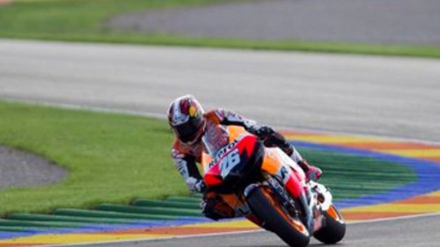 El español Dani Pedrosa ganó el domingo el Gran Premio de Valencia de MotoGP que cierra la temporada. Pedrosa, con Honda, se benefició por un choque del campeón mundial Jorge Lorenzo que le dejó expedito el primer lugar. Segundo fue Katsuyuki Nakasuga y tercero llegó el dos veces campeón mundial Casey Stoner, que se retira después de la carrera. En esta su última competencia subió al podio por sexagésima novena vez. Pedrosa había ganado la primera posición de largada en la clasificación del sábado, pero decidió aceptar la penalidad de empezar desde los puestos para cambiar neumáticos a último momento debido a una lluvia que cayó sobre la autopista de la Comunitat Valenciana de 4 kilómetros (2,48 millas). El español fue escalando posiciones rápidamente hasta quedar segundo, y pasó al frente cuando Lorenzo, con su Yamaha, resbaló en un charco faltando 17 vueltas. "Fue una carrera emocionante", afirmó Pedrosa. "Nunca había empezado desde los puestos, pero después de la vuelta de calentamiento tuve un momento de inspiración cuando supe que necesitaba cambiar neumáticos". "Es fantástico ganar la última carrera de la temporada". Fue su triunfo número 22 en MotoGP. Terminó el campeonato mundial en segundo lugar detrás de Lorenzo, pero sus siete victorias en la temporada le dan una más que su compatriota. Lorenzo ganó el campeonato con 350 puntos, seguido de Pedrosa con 332 y Stoner 254. Siete de 21 competidores no pudieron terminar la accidentada competencia.